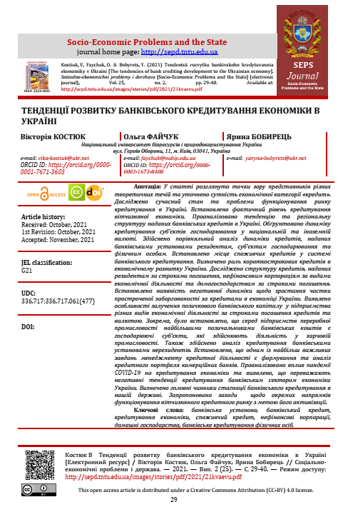 Костюк В.А., Файчук О.В., Бобирець Я.В. Тенденції розвитку банківського кредитування економіки в Україні // Соціальноекономічні проблеми і держава. — 2021. — Вип. 2 (25). — С. 29-40. — Режим доступу: