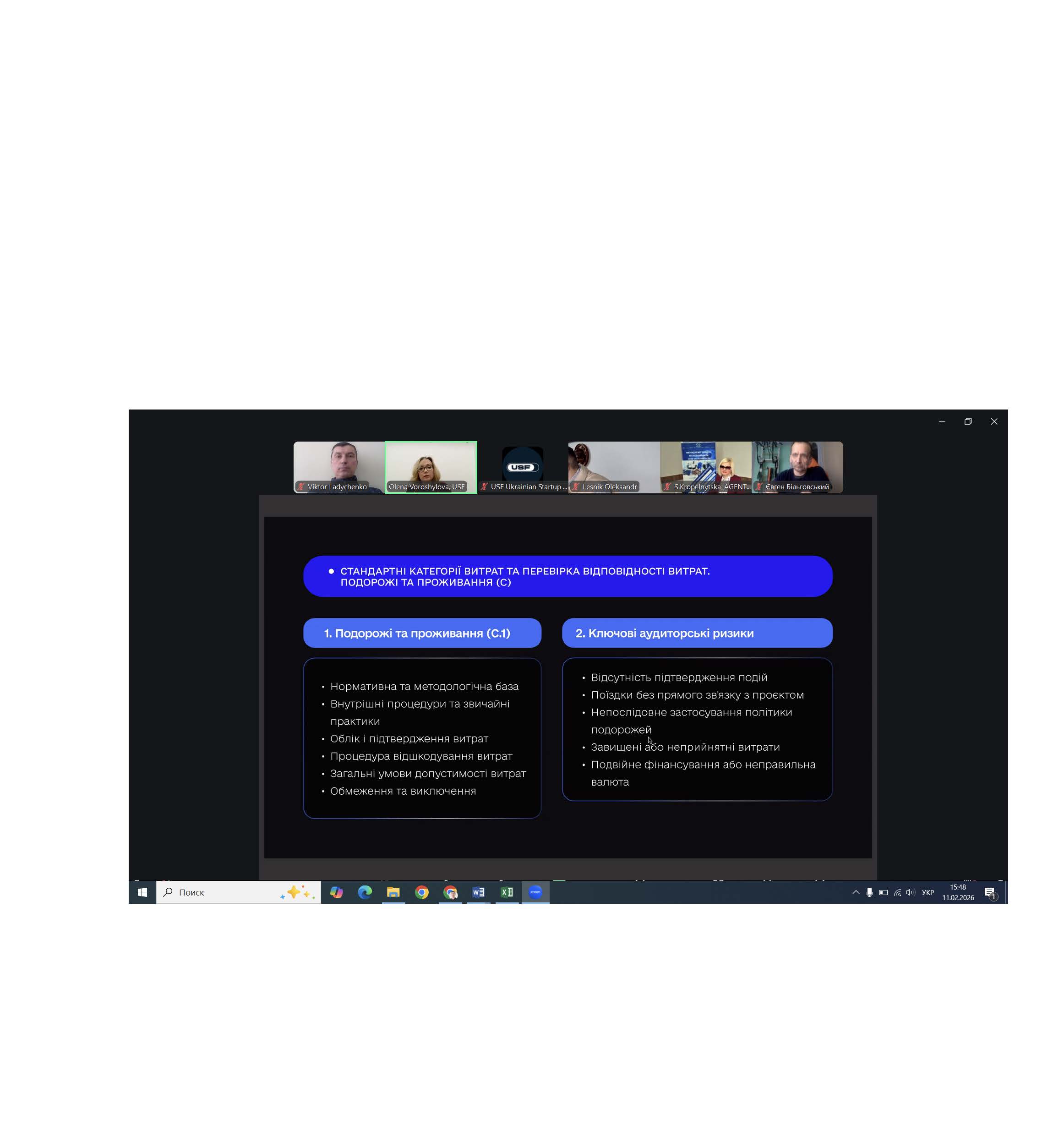 11 лютого 2026 року керівник проекту Віктор Ладиченко взяв участь в онлайн-воркшопі «Audit Smart: як успішно пройти аудит європейських грантів». Воркшоп проводився Ukrainian Startup Fund