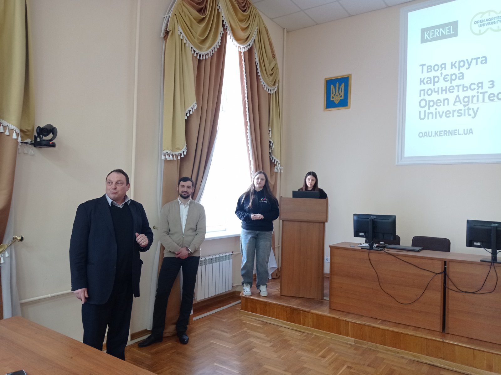 Зустріч відбулася за участі представників компанії «Кернел», зокрема Олександра Волощука — головного технолога департаменту зберігання. Під час лекції він презентував студентам Open AgriTech University — унікальний освітній проєкт компанії Kernel, спрямований на швидке занурення студентів у сучасний агротехнологічний бізнес із можливістю розпочати кар’єру в команді лідера галузі України.