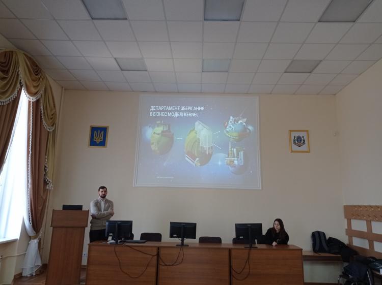 Окрему увагу спікер приділив тому, як студентам успішно пройти навчання в межах програми та отримати можливість працевлаштування в компанії. Також він розповів про розвиток і успіхи компанії, ознайомив присутніх із діяльністю переробних заводів Kernel, їхніми потужностями та роллю в аграрному секторі України та світу.