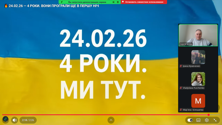 Викладачі кафедра міжнародних відносин і суспільних наук та куратори студентських груп міжнародників провели серію тематичних виховних заходів. Ці зустрічі стали не лише даниною пам’яті, а й майданчиком для глибокого аналізу подій, що назавжди змінили світ та фах міжнародника. Спільно згадали перші дні вторгнення, відзначивши неймовірну консолідацію українського суспільства та роль кожного у спротиві. Особливу увагу приділили обговоренню того, як Україна виборює підтримку на міжнародній арені. Для майбутніх фахівців-міжнародників це стало практичним уроком кризової дипломатії та стратегічних комунікацій. Студенти та викладачі вшанували хвилиною мовчання пам’ять захисників, серед яких і вихованці гуманітарно-педагогічного факультету й кафедри зокрема, що віддали життя за свободу країни. Куратори наголосили на важливості протидії дезінформації в умовах тривалої війни, що є критичною навичкою для сучасних суспільствознавців. «Ці чотири роки навчили нас, що історія пишеться не лише в підручниках, а й нашими вчинками сьогодні. Для студентів-міжнародників розуміння причин та наслідків цієї війни – це фундамент їхньої майбутньої професійної ідентичності», - зауважили організатори заходів. Такі заходи допомагають молоді не лише зберігати історичну пам’ять, а й формувати чітку громадянську позицію та розуміння своєї ролі у відбудові та європейській інтеграції України.