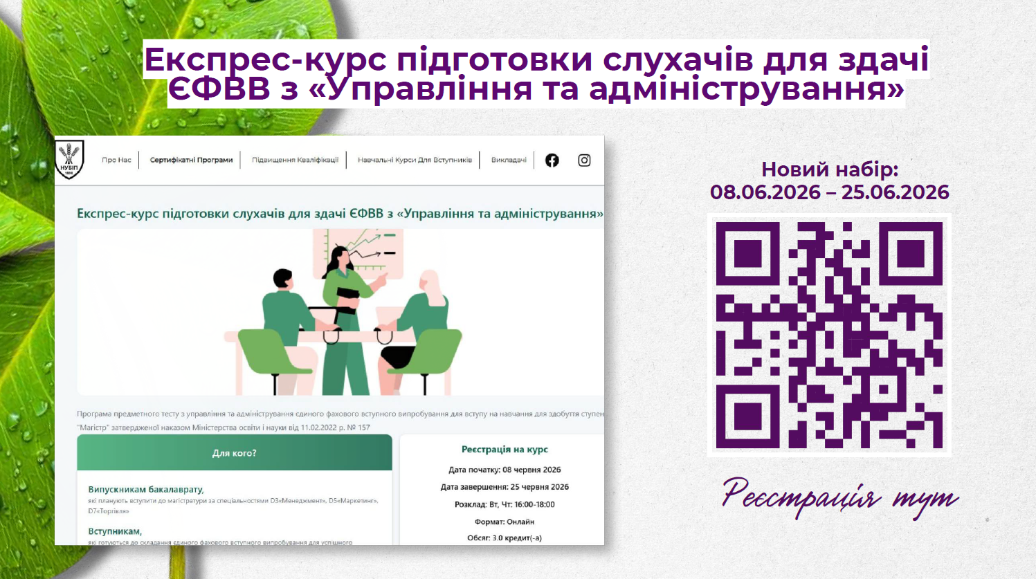 Також було оголошено про можливості студентів отримати концентровані знання для здачі іспиту ЄФВВ з Управління та адміністрування шляхом проходження експрес-курсу в терміни 08-25.06.2026.