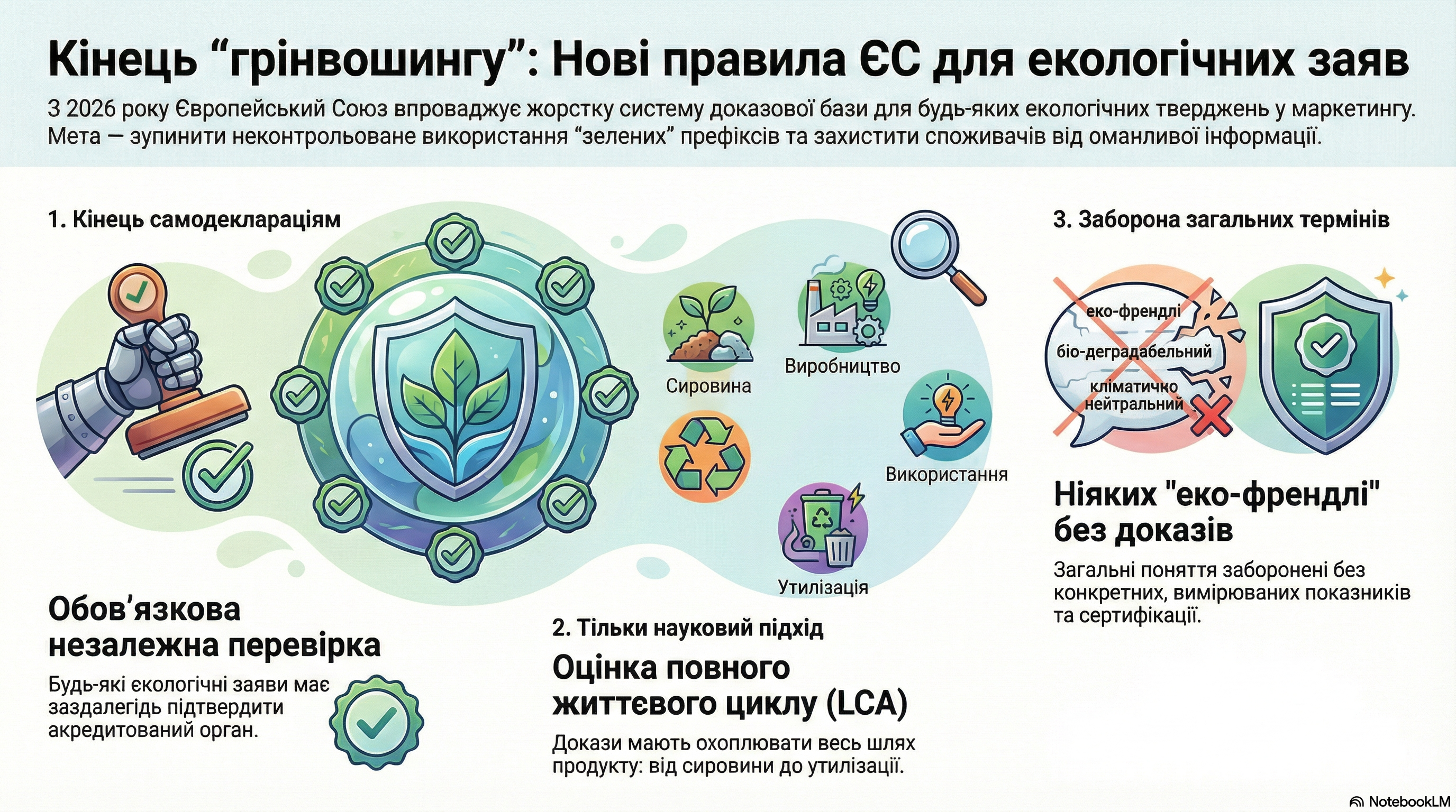 Даний матеріал підготовлено на основі аналізу офіційних релізів Європейської Комісії, текстів Директиви (EU) 2024/825 щодо розширення прав споживачів для зеленого переходу та проектів імплементаційних актів Green Claims Directive станом на початок 2026 року.