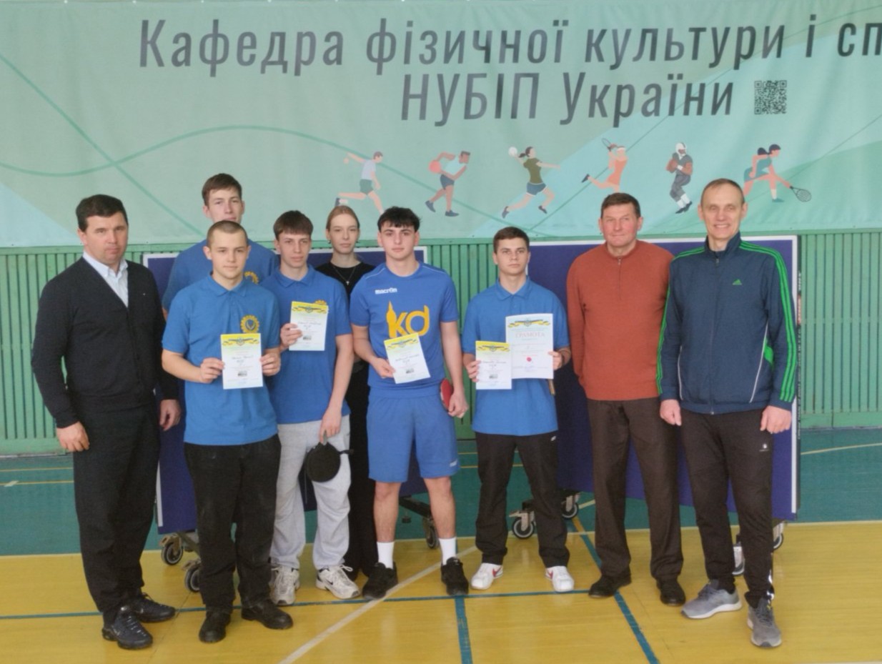 19 березня 2026 року Олександр ПОЛІЩУК 3 курс ОПП «Машинобудування», Єлизавета ТЕРЕЩЕНКО 1 курс ОПП «Будівництво та цивільна інженерія», Владислав ШАПОВАЛ 1 курс ОПП «Будівництво та цивільна інженерія», Денис ОСАДЧИЙ 2 курс ОПП «Машинобудування» і Євгеній ТРОЯН 2 курс ОПП «Машинобудування» команда факультету конструювання та дизайну виборола бронзу під час участі у спартакіаді студентів Національного університету біоресурсів і природокористування України з виду спорту «Настільний теніс».