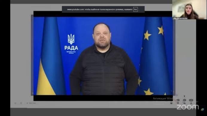 Із вітальним словом до учасників звернувся Голова Верховної Ради України Руслан Стефанчук, зазначивши, що сьогодні соборність - це не лише дата в календарі, а принцип, за який ми боремося. Соборність - це усвідомлення, що Україна єдина, згуртованість тилу і фронту, відповідальність один за одного. Тому дуже важливо говорити про це з молоддю, з тими, від кого залежить майбуття.