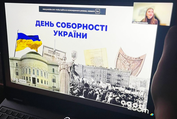 Освітній центр Верховної Ради України організував Всеукраїнський онлайн-захід до Дня Соборності України. Студенти 1 курсу спеціальності «Журналістика» разом з куратором Світланою ЛИТВИНСЬКОЮ охоче взяли участь у цьому заході, адже вміння оперувати правдивими й незаангажованими знаннями з історії української державності надзвичайно важливе у їхній діяльності.