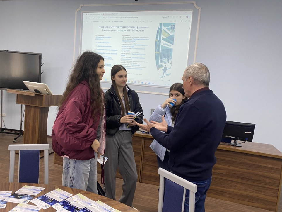 Зі словами привітання та підтримки до гостей звернулася заступник декана Наталія Клименко, а завідувачі кафедр Наталія РОГОЗА, Михайло ШВИДЕНКО, Дмитро КАСАТКІН, Белла ГОЛУБ докладніше ознайомили школярів зі спеціальностями та освітніми програмами, що реалізуються на факультеті.
