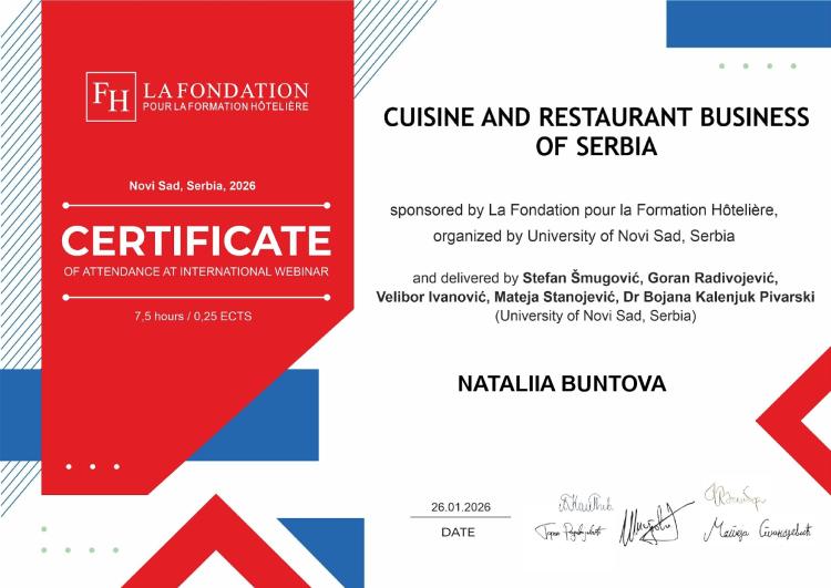 Експертні виступи представників Університету Нові-Саду та практиків у сферах гастрономії, менеджменту гостинності й маркетингу наповнили вебінар прикладними кейсами та актуальними професійними інсайтами.