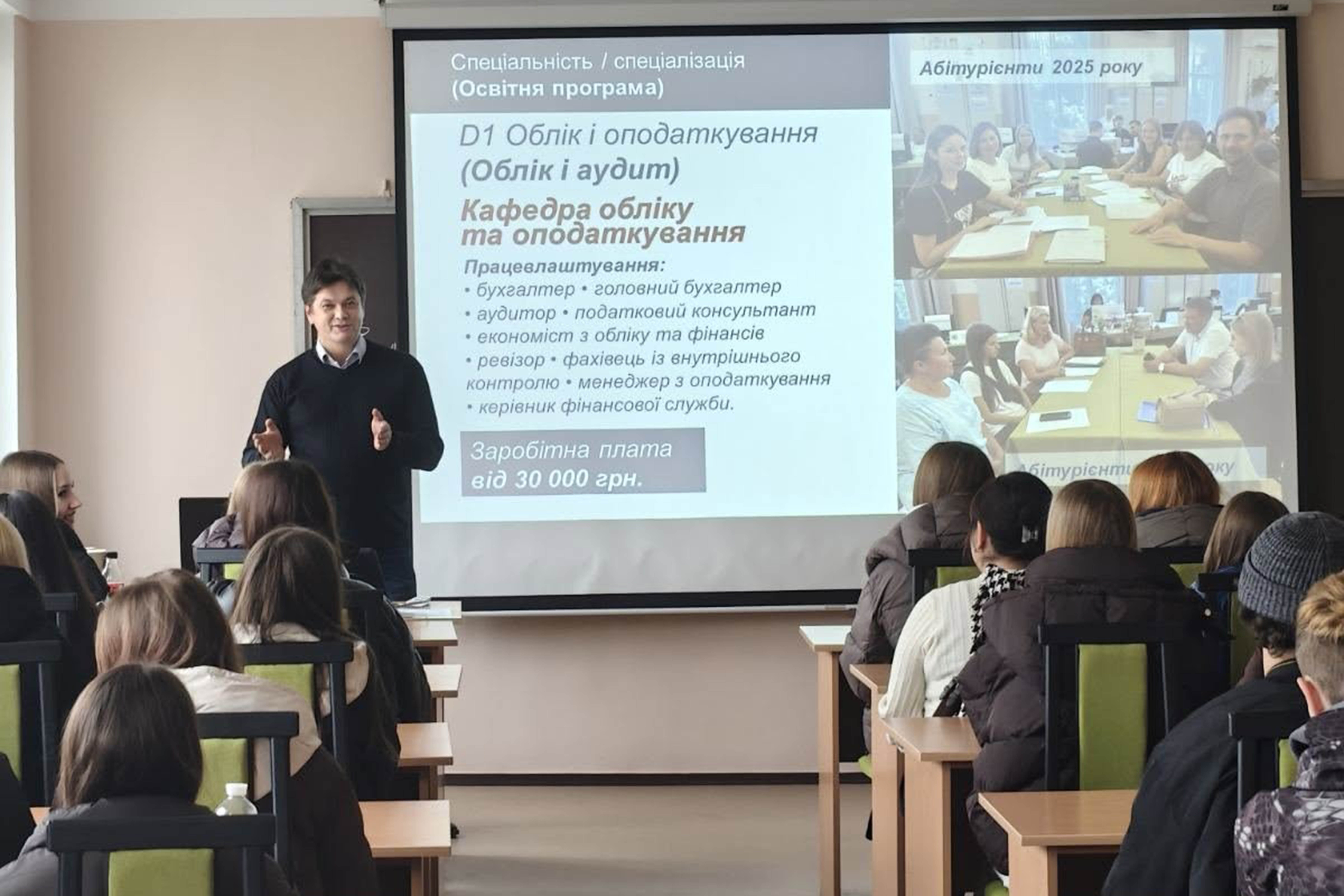 Гостей гостинно зустріли представники кафедри статистики та економічного аналізу. Завідувач кафедри, професор Анатолій ДІБРОВА, ознайомив школярів зі структурою факультету, особливостями навчання за освітньою програмою «Бізнес-аналіз і облік» спеціальності D1 «Облік і оподаткування» освітнього ступеня «Бакалавр». Він наголосив на перевагах цієї програми, зокрема на формуванні компетентностей, що дозволяють збирати та аналізувати дані, інтерпретувати результати й приймати обґрунтовані управлінські рішення у сфері бізнесу. Детальніше тут: https://surl.li/sqcaos