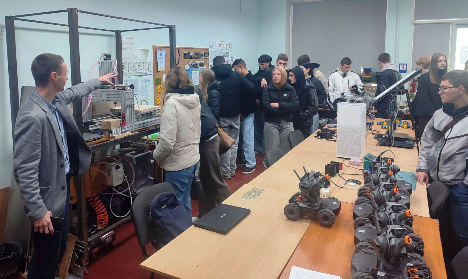 Далі екскурсія теренами факультету продовжилася у сучасній лабораторії робототехніки. Проф. Ромасевич Ю.О. закцентував увагу на перевагах вибору професії за спеціальністю G11 та наочно продемонстрував алгоритм реалізації повного циклу створення робототехнічних систем — від 3D-моделювання та виготовлення прототипів до розробки систем керування й інтелектуальних алгоритмів сучасних адаптивних механізмів.