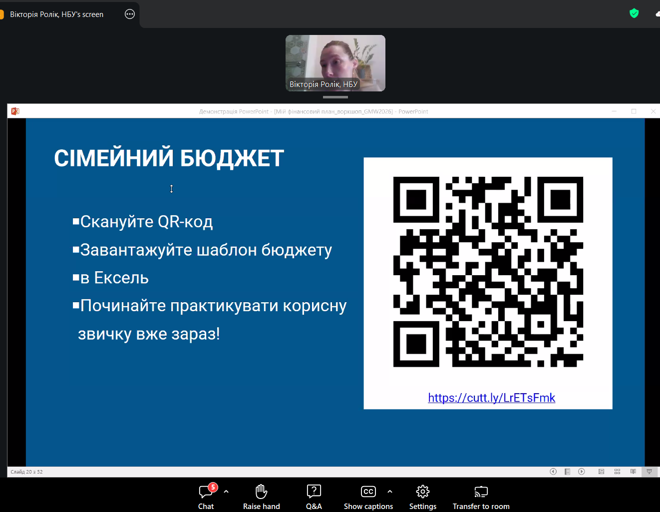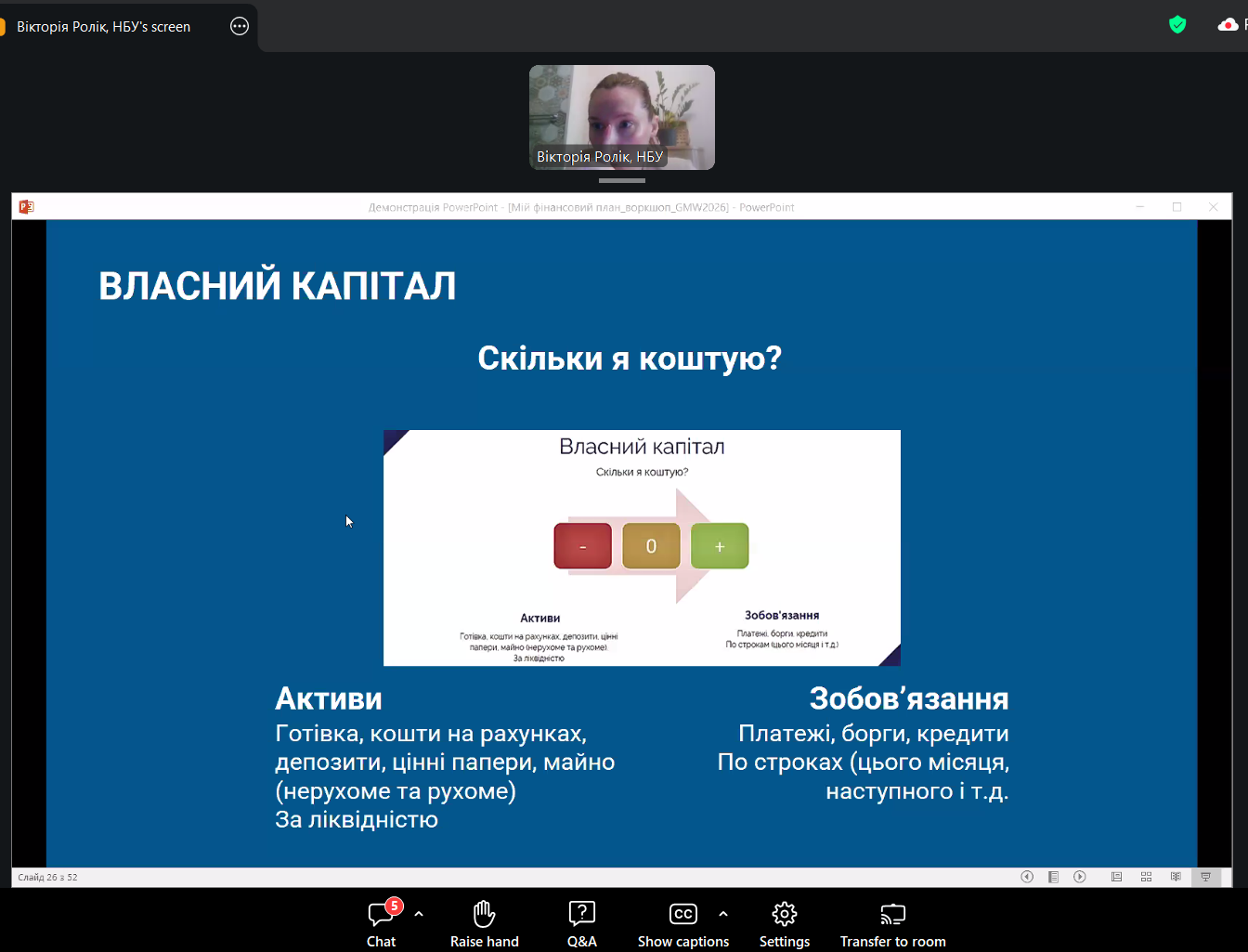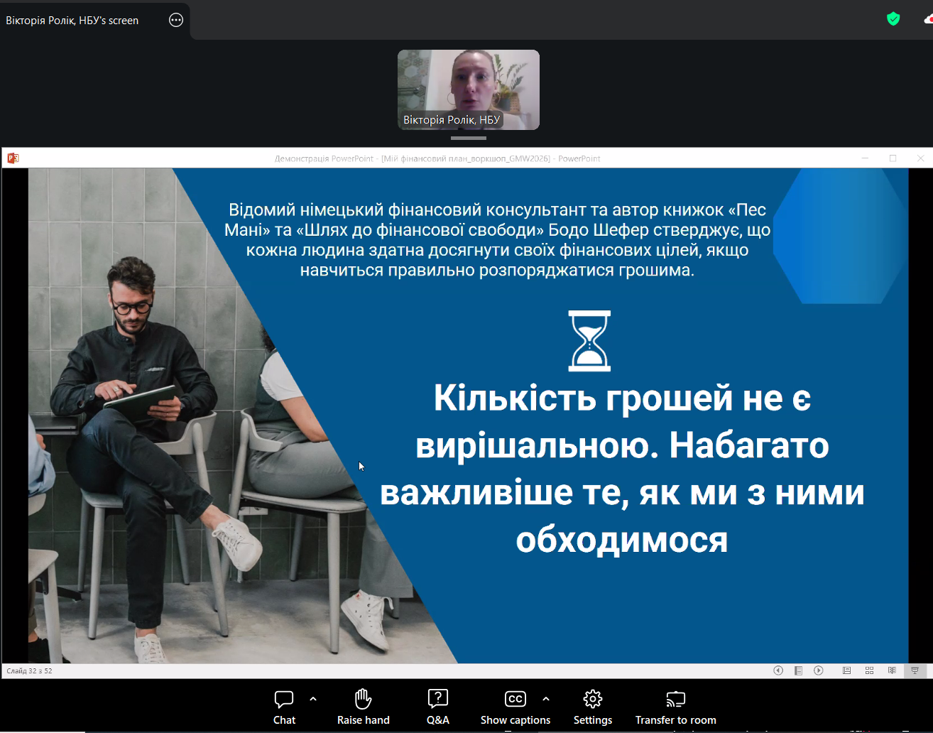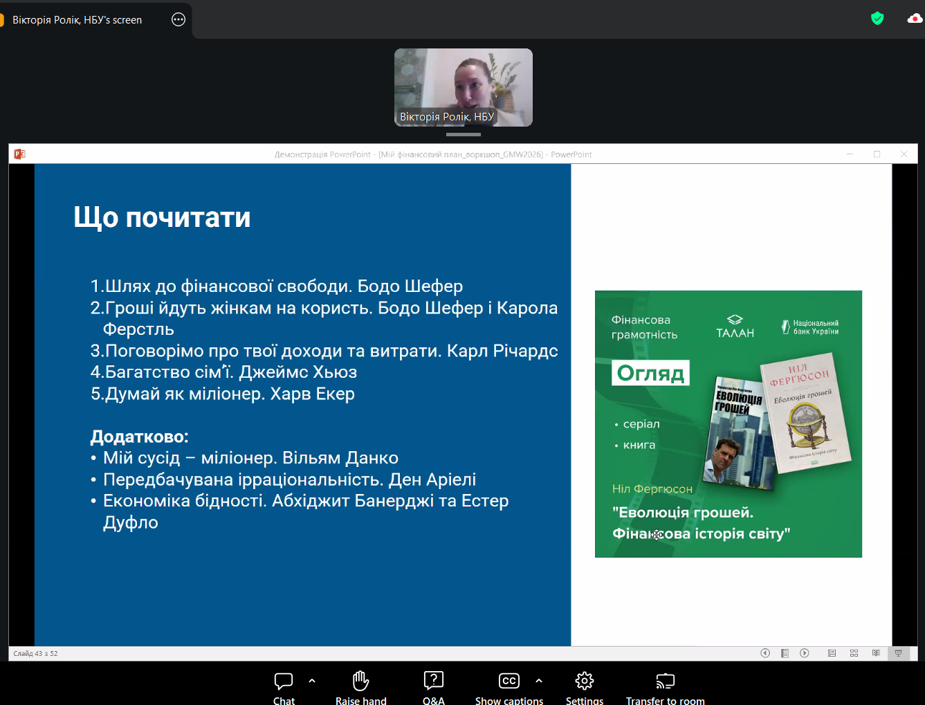 Зустріч відбулась у ZOOM. Спікеркою заходу виступила Вікторія РОЛІК — керівниця Центру фінансових знань «ТАЛАН» Національного банку України. Освітні ініціативи Центру фінансових знань «ТАЛАН» відіграють важливу роль у популяризації фінансової освіти та розвитку практичних компетентностей, необхідних для прийняття обґрунтованих фінансових рішень у сучасному економічному середовищі.