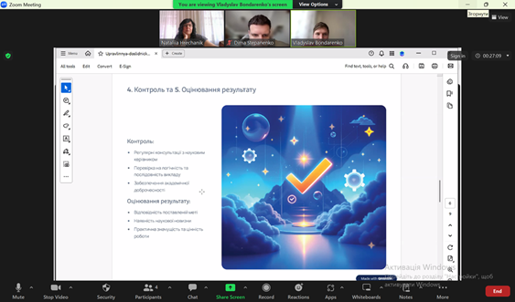 Не менш важливим етапом є підсумкова рефлексія: магістранти аналізують результати своєї роботи, оцінюють досягнення й труднощі, узагальнюють отриманий досвід у звіті та презентують його під час захисту. Це дозволяє не лише зафіксувати результати, а й усвідомити власне зростання як дослідника.