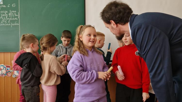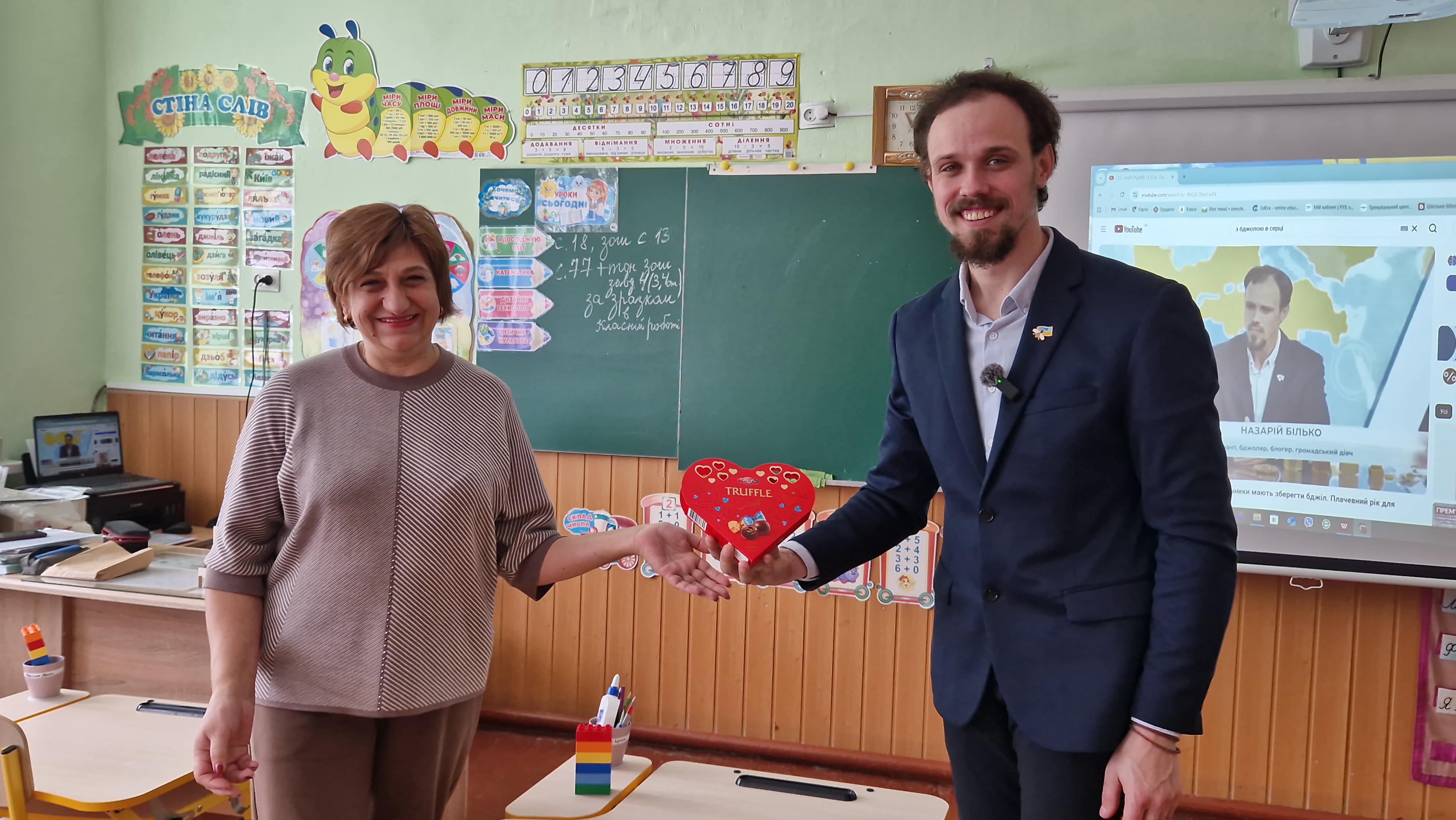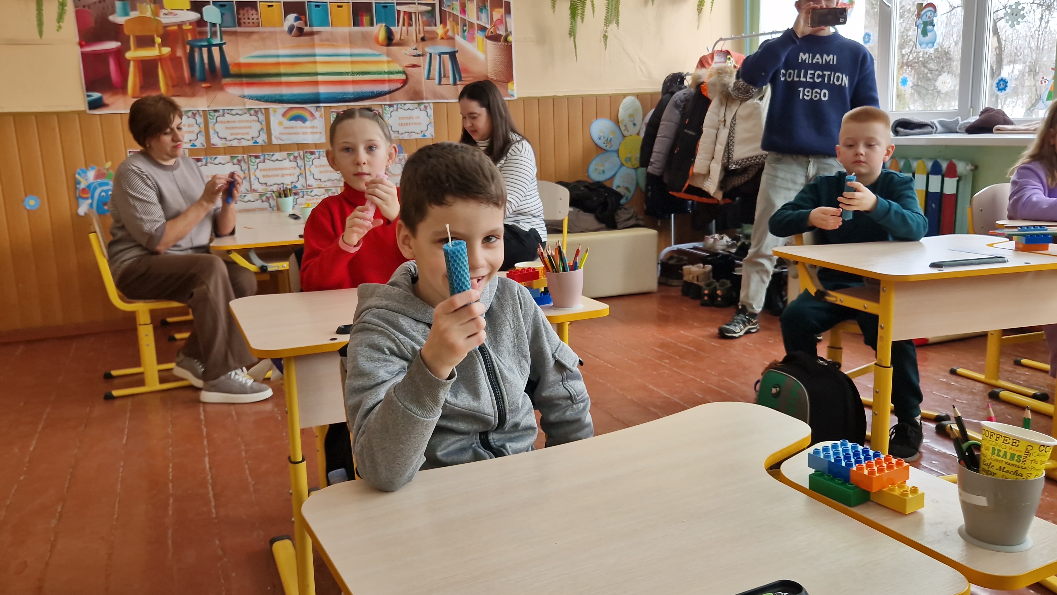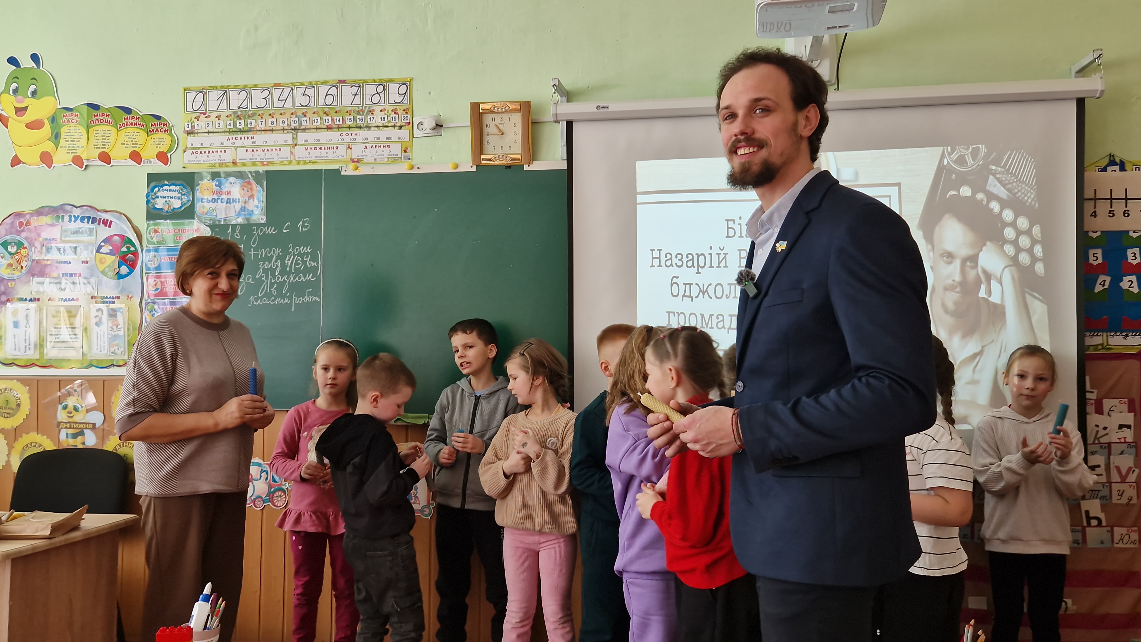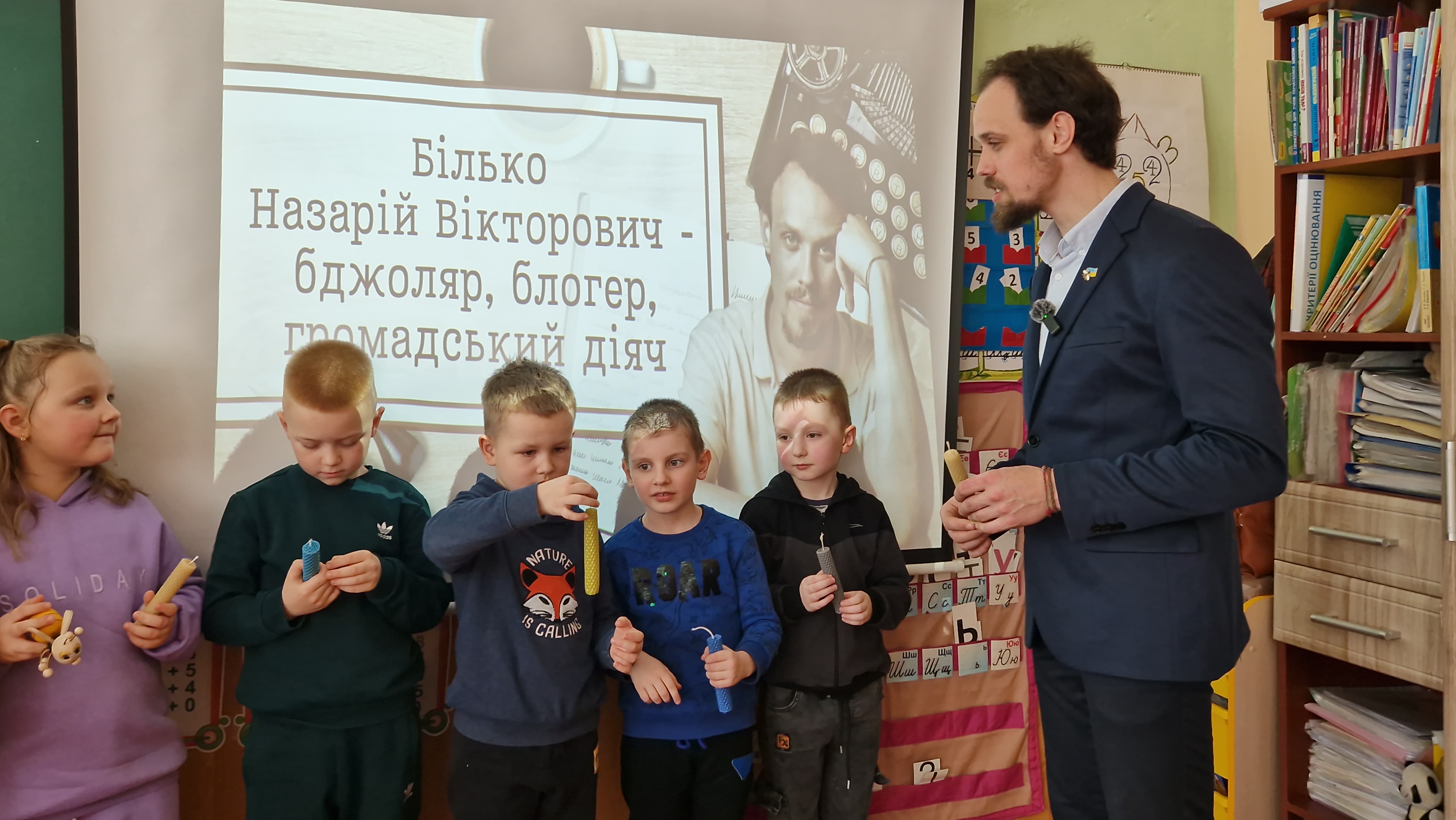 Спочатку ми відвідали перший клас, де для дітей провели майстер-клас з виготовлення свічок із вощини, познайомили їх зі світом бджільництва та професією бджоляра.