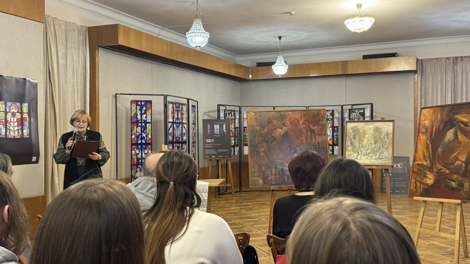 Перше, що впало студентам в очі, коли вони ввійшли до залу, де відбувалося дійство, – розставлені вітражі виставки «Обережно Крихке!», присвяченій утраченим шедеврам Маріупольського музею монументального мистецтва. На жаль, зараз їх можна побачити хіба що на світлинах, позаяк ці оригінальні витвори знищили російські окупанти навесні 2022 року.