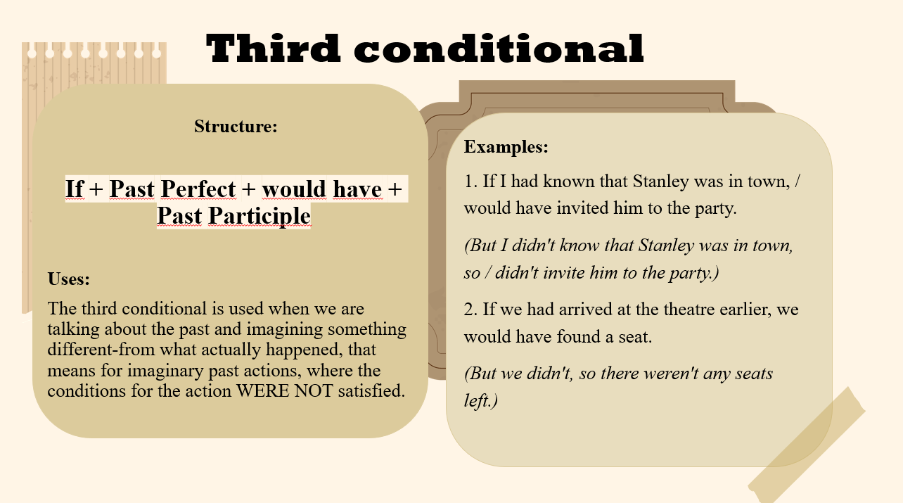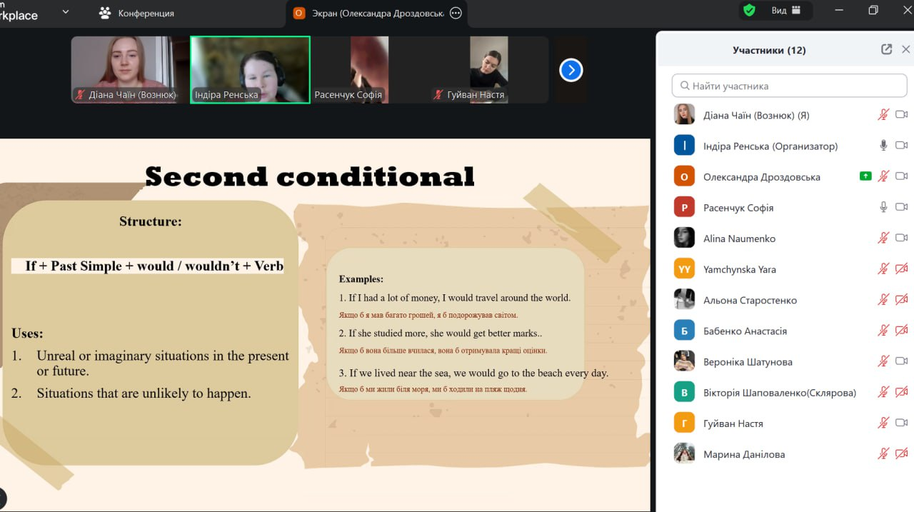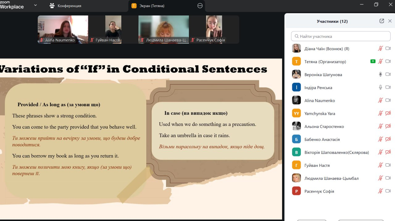 Під час заняття студенти повторили та узагальнили граматичну тему умовних речень в англійській мові. На початку викладач коротко окреслила основні типи conditional sentences, після чого студенти представили підготовлені повідомлення про кожен тип умовних речень (0, 1, 2 та 3). Після кожного виступу викладач коментувала відповіді студентів, узагальнювала основні положення та ставила запитання до всієї групи для перевірки розуміння матеріалу. Після презентацій студенти виконали граматичні вправи для закріплення теми. Викладач коректно й професійно коментувала відповіді, звертаючи увагу на типові помилки та допомагаючи студентам їх виправити.