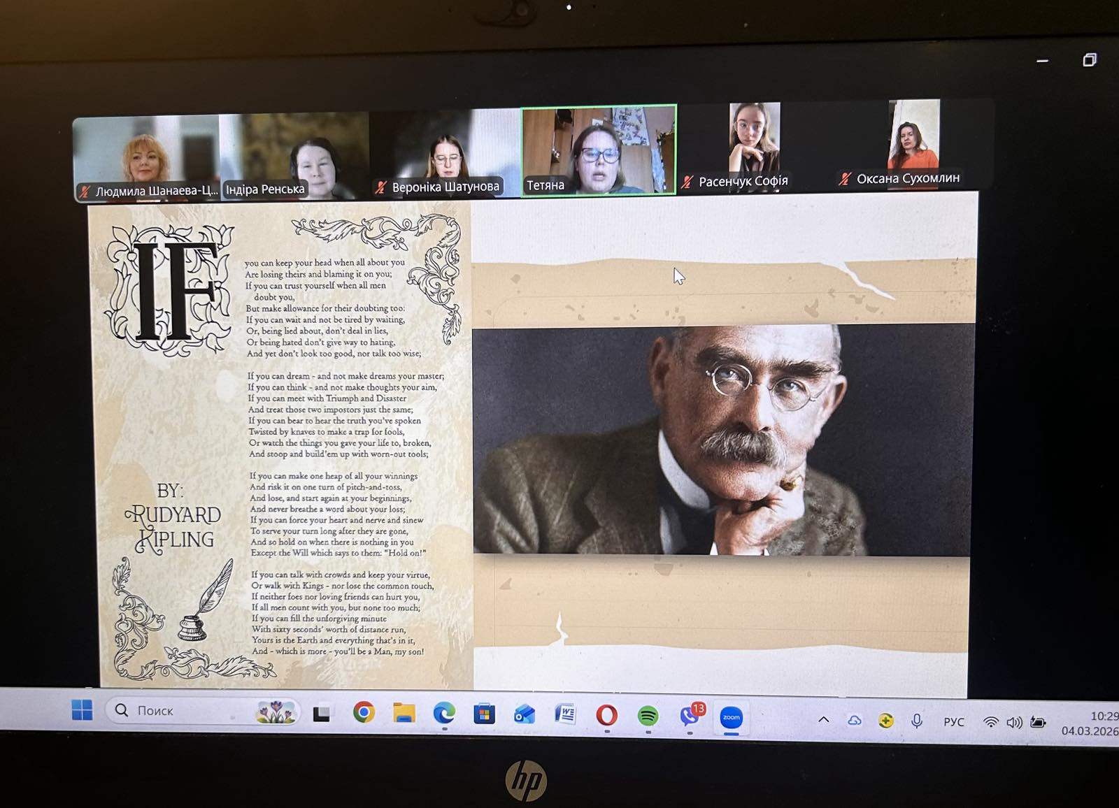 Друга частина заняття була присвячена творчості Ред’ярда КІПЛІНГА – відомого британського письменника, лауреата Нобелівської премії з літератури 1907 року, який на той час став наймолодшим лауреатом цієї престижної нагороди. Викладач ознайомила студентів із цікавими фактами з життя митця, після чого студенти декламували уривки з його відомого вірша «If—» («Якщо»). У ході обговорення студенти відповідали на запитання викладача щодо моральних цінностей, які порушує автор у своєму творі, та міркували про їх актуальність у сучасному світі.