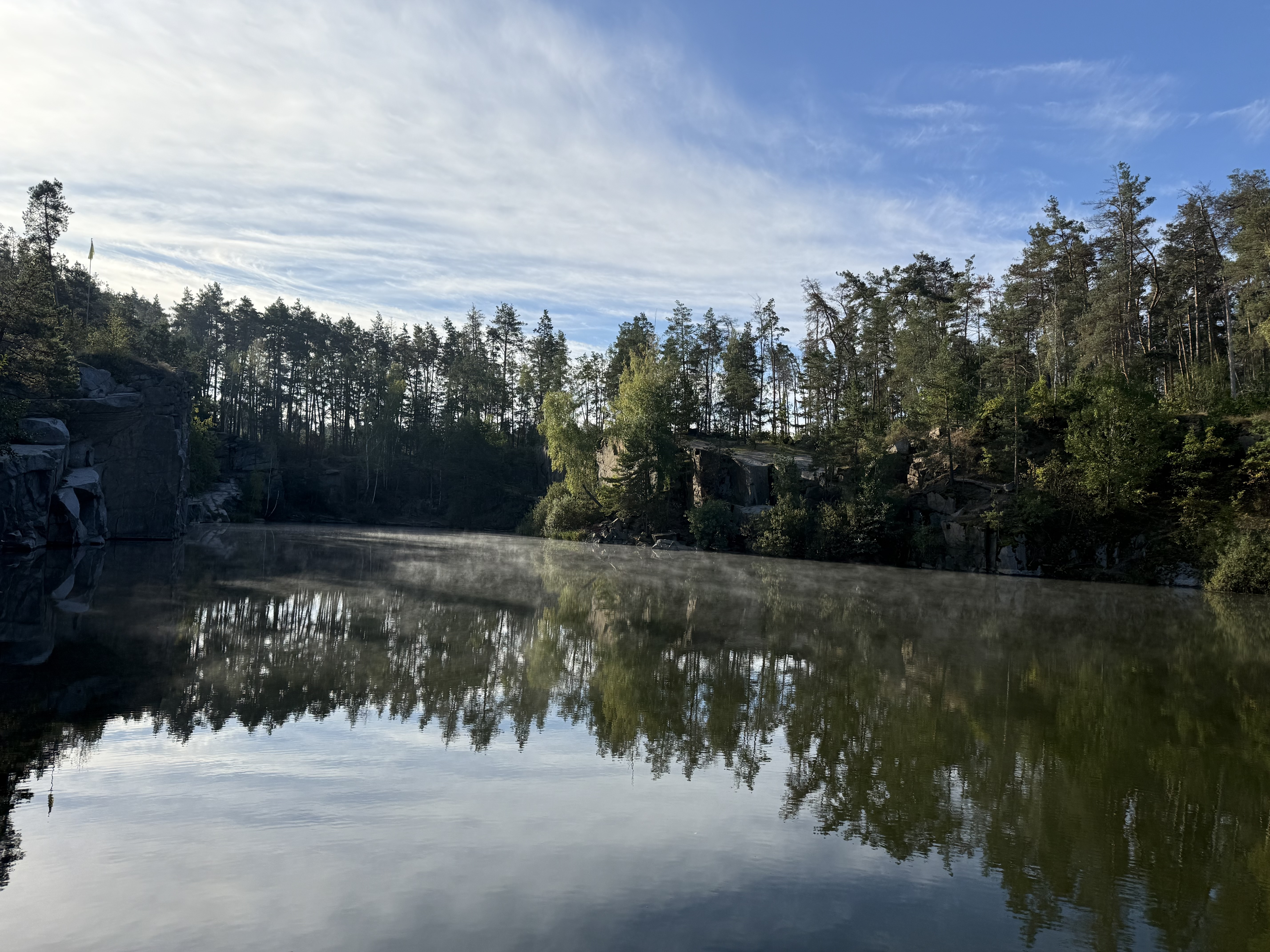 Житомирська область, зокрема місцевість, де знаходиться Коростишівський кар’єр славиться різноманітністю та унікальністю корисних копалин. На її території розміщується понад півтисячі родовищ корисних копалин, серед яких рудні, родовища паливно-енергетичної сировини, титан-цирконієві руди, метали платинової групи, а також граніт. Граніт нерозривно пов’язаний з кар’єром в Коростишеві, саме там у 1850 році розпочали розбудову та розробку гранітних покладів, а вже наприкінці ХІХ століття, регіон став головним і одним з важливих центрів, де видобували та обробляли камінь. Після припинення видобутку кар’єр затопили, і утворилося штучне озеро з бірюзовою водою, оточене скелями та лісом. Це місце — як портал у природу, де наш колектив насолодився мальовничими краєвидами.