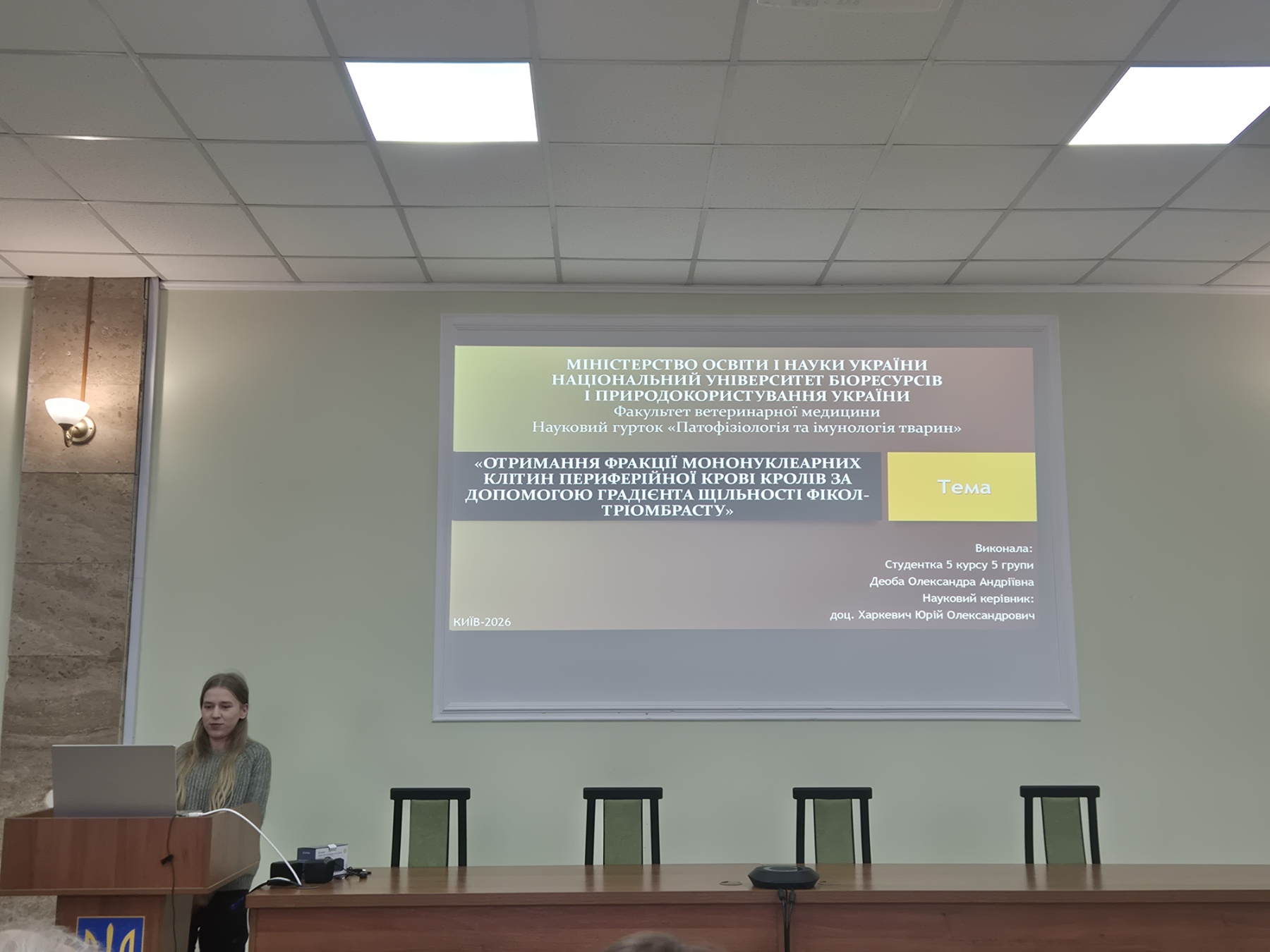 23 березня 2026 року на факультеті ветеринарної медицини Національного університету біоресурсів і природокористування України відбулася наукова подія – І етап Всеукраїнського конкурсу студентських наукових робіт. Захід проходив за головування координатора з наукової роботи Науково-дослідного інституту здоров’я тварин, професора, д. вет. н. Ірини ДЕРКАЧ; відповідальним за організацію наукового заходу був призначений заступник очільника НДІ з питань студентської наукової діяльності доцент, к.вет.н. Роман БОКОТЬКО.