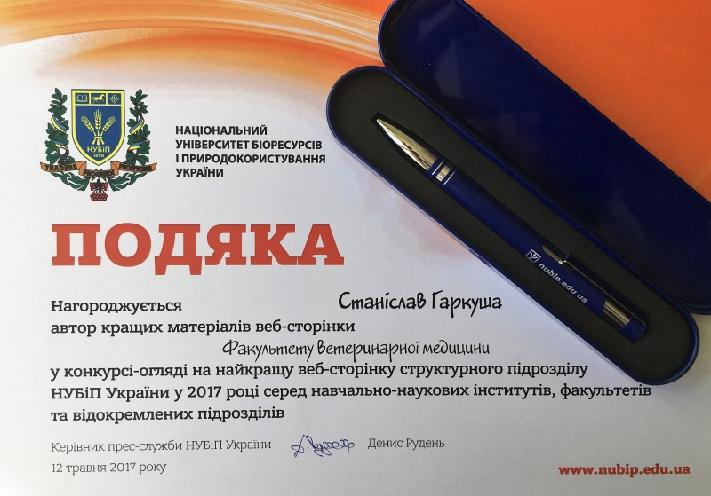 На факультеті ветеринарної медицини кращим автором веб-сторінки став доцент кафедри патологічної анатомії кандидат ветеринарних наук Гаркуша Станіслав Євгенович. Він отримав відповідну подяку від керівництва прес-служби університету та пам’ятний сувенір.