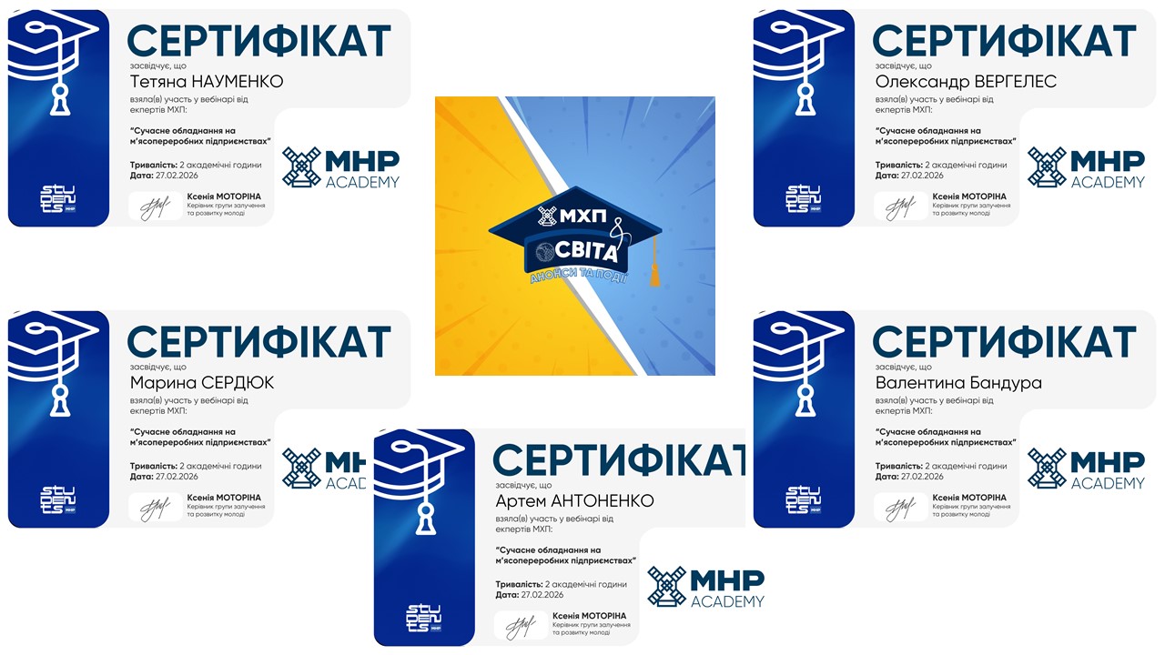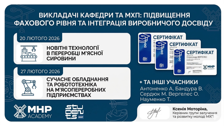 У лютому 2026 року науково-педагогічні працівники кафедри стандартизації та сертифікації сільськогосподарської продукції факультету харчових наук, нутриціології та управління якістю долучилися до масштабного освітнього проєкту - серії фахових онлайн-лекцій від міжнародної компанії у сфері харчових та агротехнологій МХП.