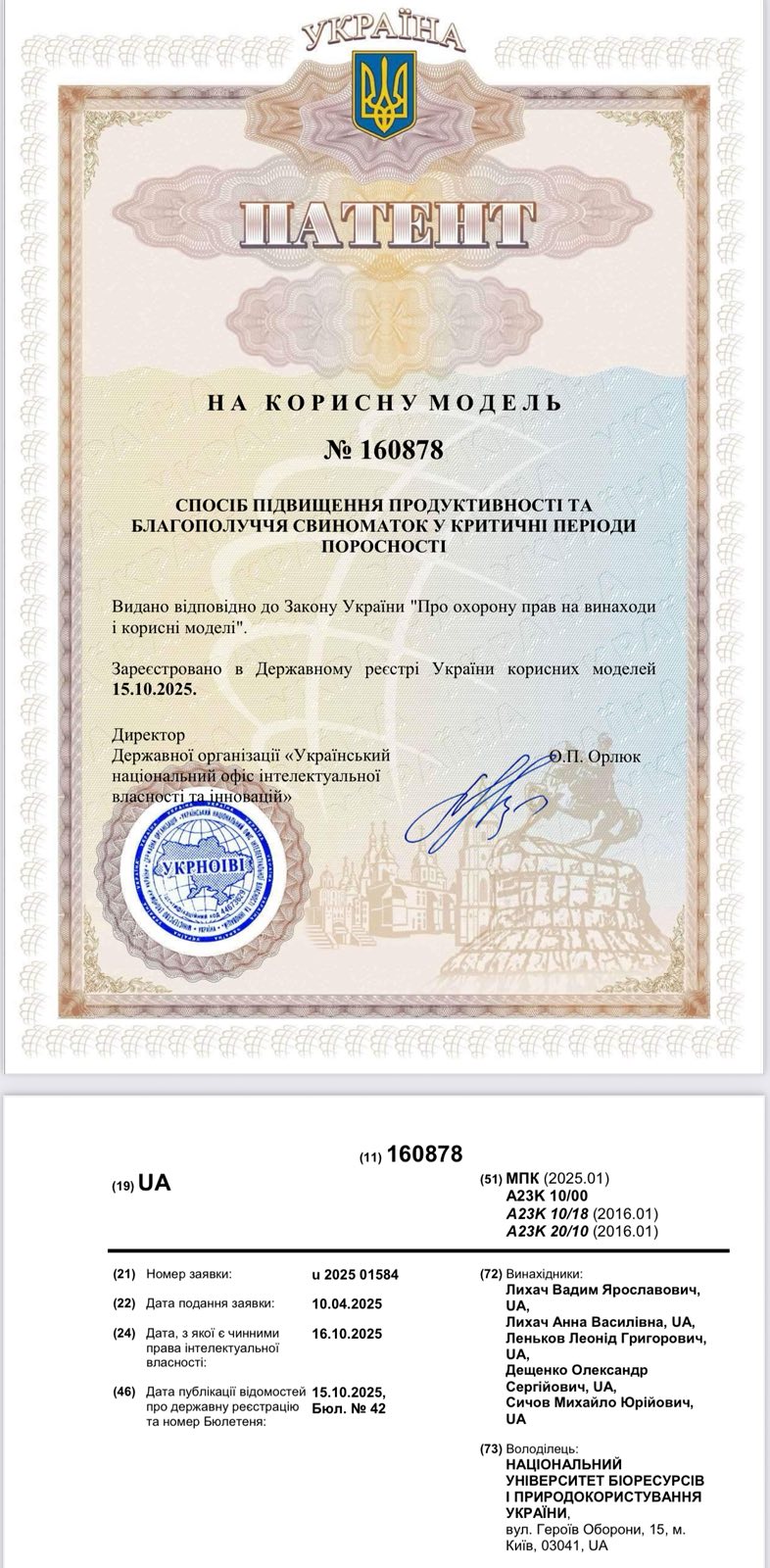 Патент зареєстровано в Державному реєстрі України корисних моделей 15 жовтня 2025 року. Власником є Національний університет біоресурсів і природокористування України, що підтверджує високий рівень науково-дослідної діяльності університету.