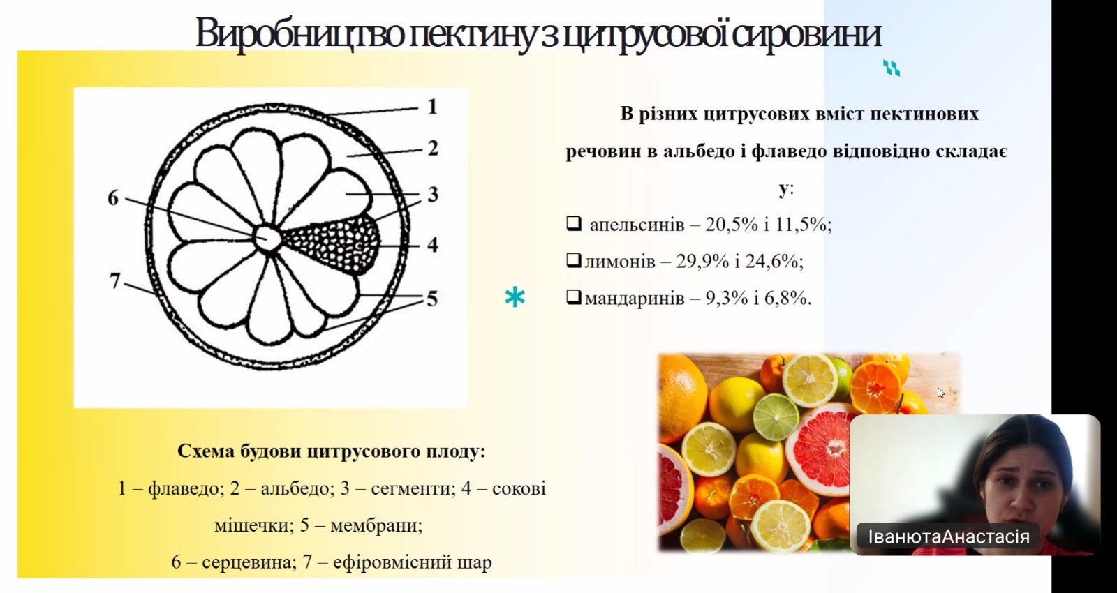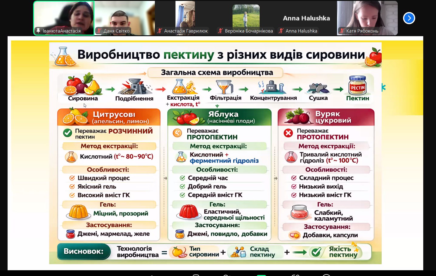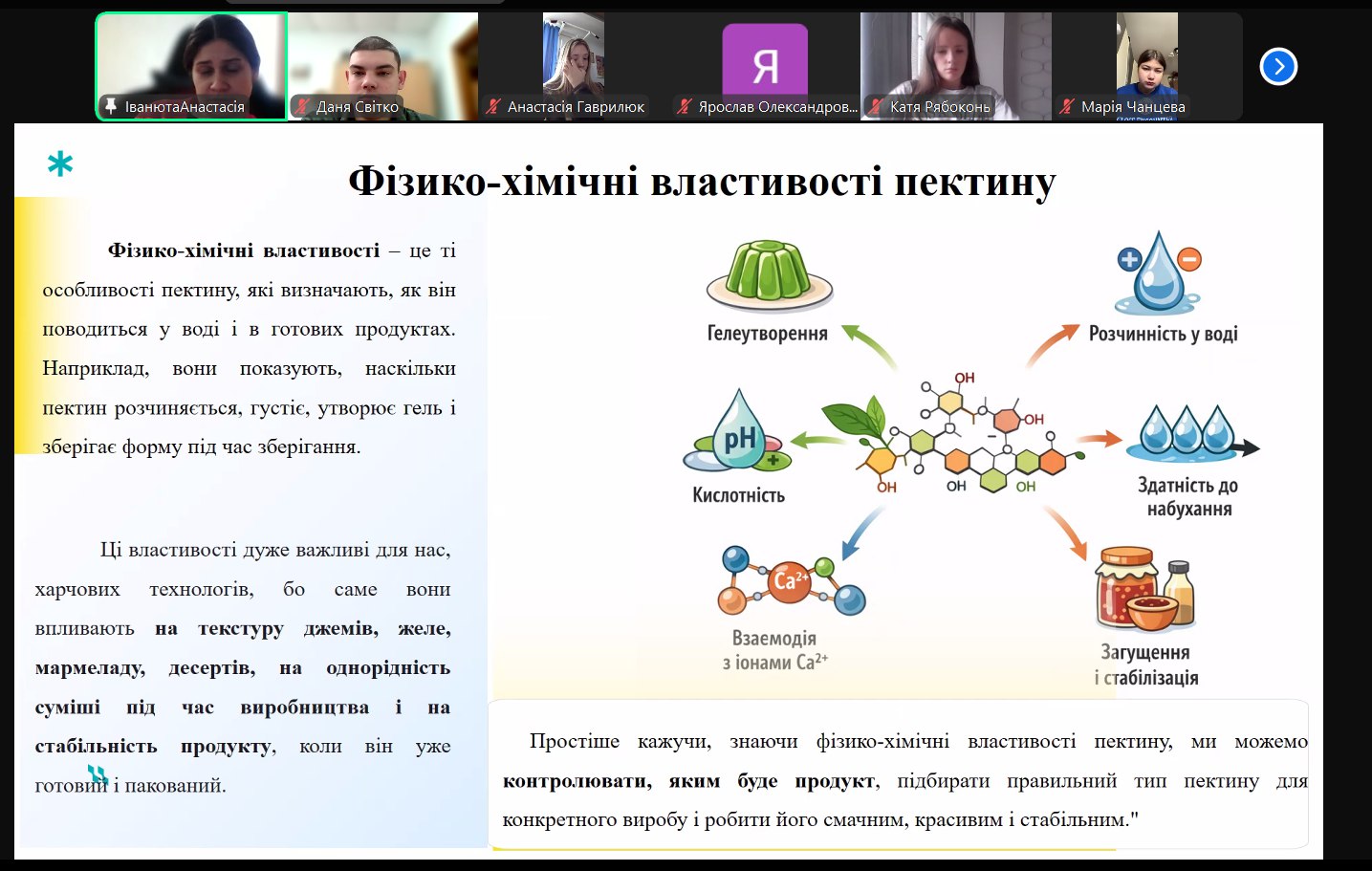 У межах лекції студенти ознайомилися з будовою та фізико-хімічними властивостями пектинових речовин, основними сировинними джерелами їх отримання, етапами технологічного процесу та показниками якості пектину відповідно до чинних нормативних вимог.