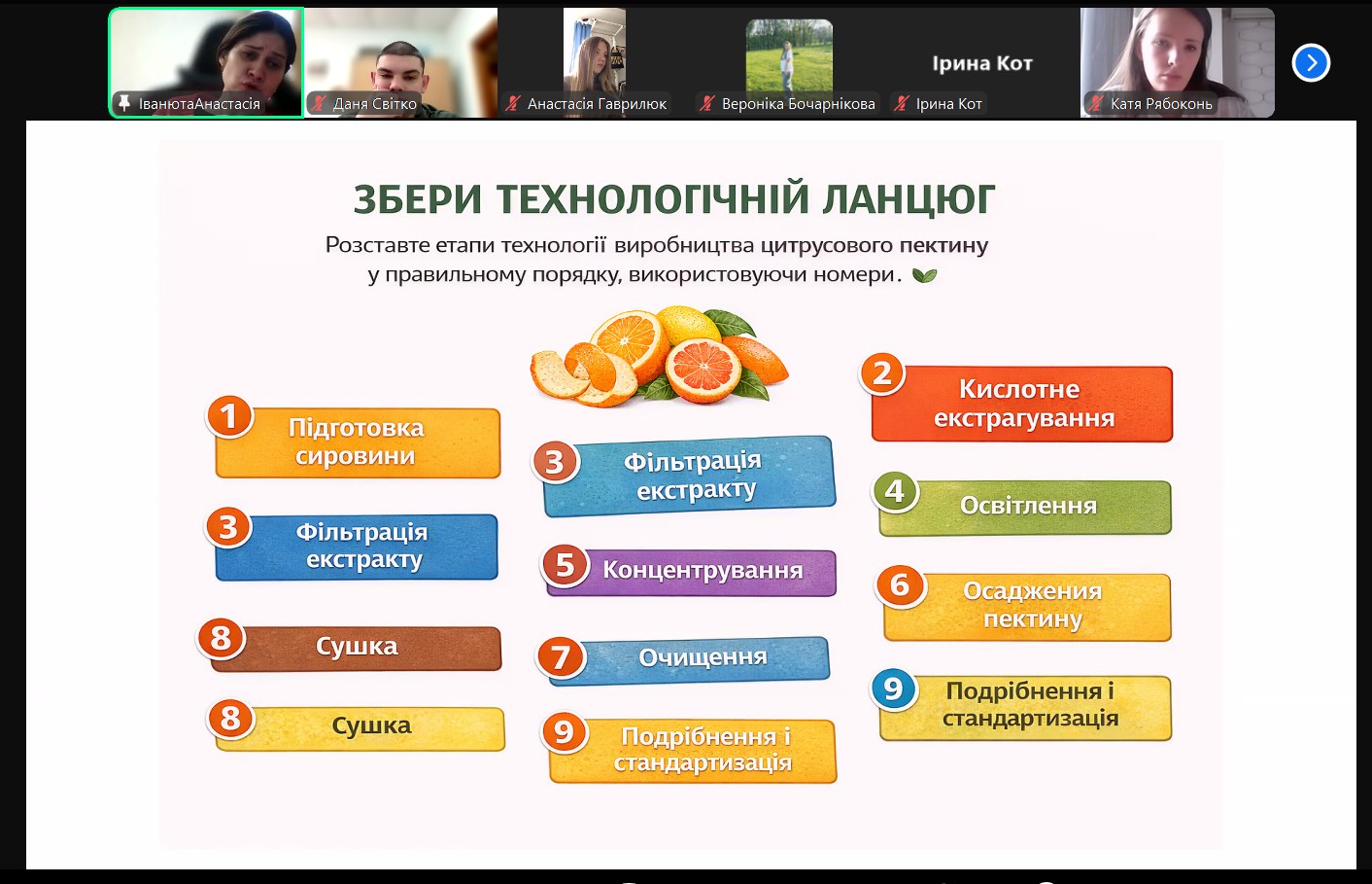 Лекторка застосувала різноманітні сучасні методики та засоби навчання, зокрема інтерактивні тестування, де студенти обирали правильні відповіді на практичні питання, а також виконували завдання на складання технологічного ланцюга з окремих фрагментів, що відтворював основні етапи виробництва пектину.