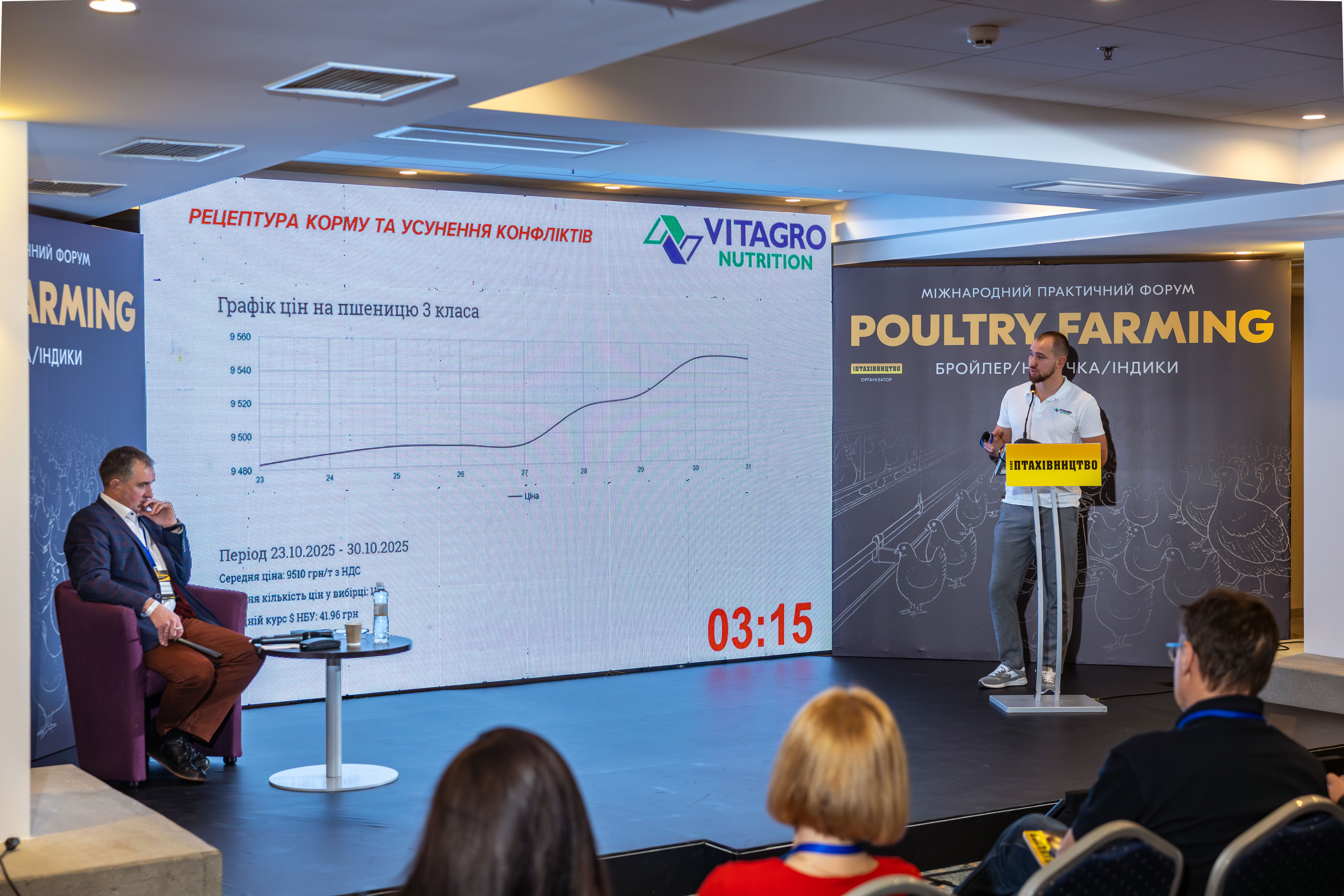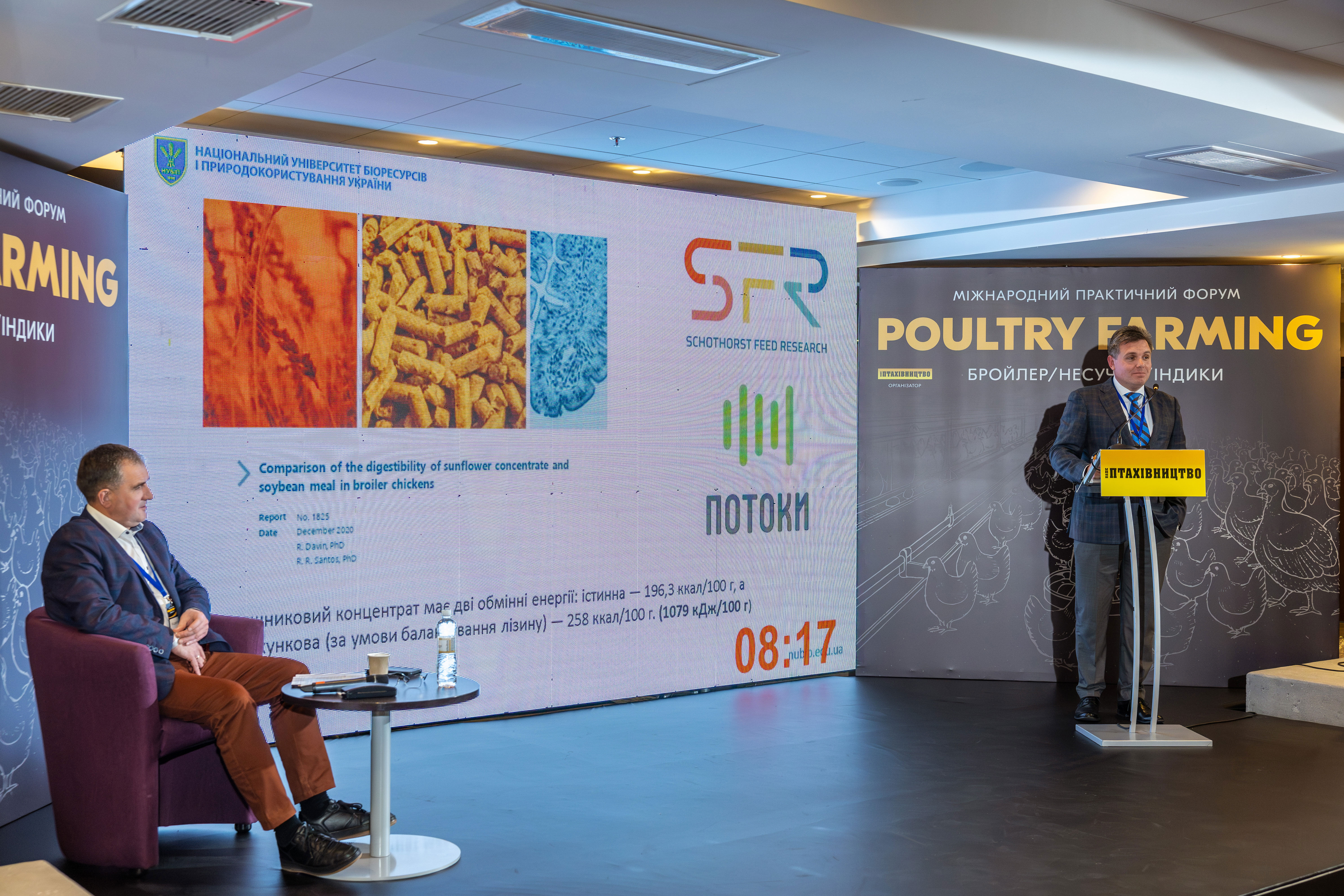 На завершення професор СИЧОВ представив економічне обґрунтування доцільності використання високопротеїнового соняшникового шроту порівняно з соєвим шротом і макухою. Результати свідчать, що такий підхід дозволяє зменшити витрати на годівлю без зниження продуктивності птиці. Доповідь викликала жваву дискусію серед учасників форуму, а на всі запитання було надано вичерпні та компетентні відповіді.
