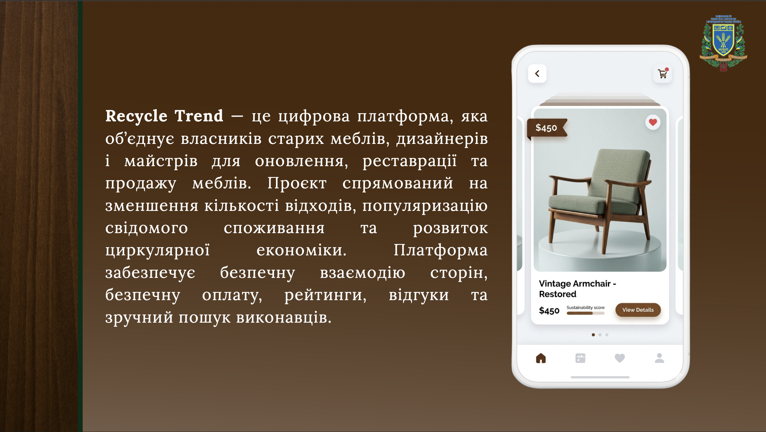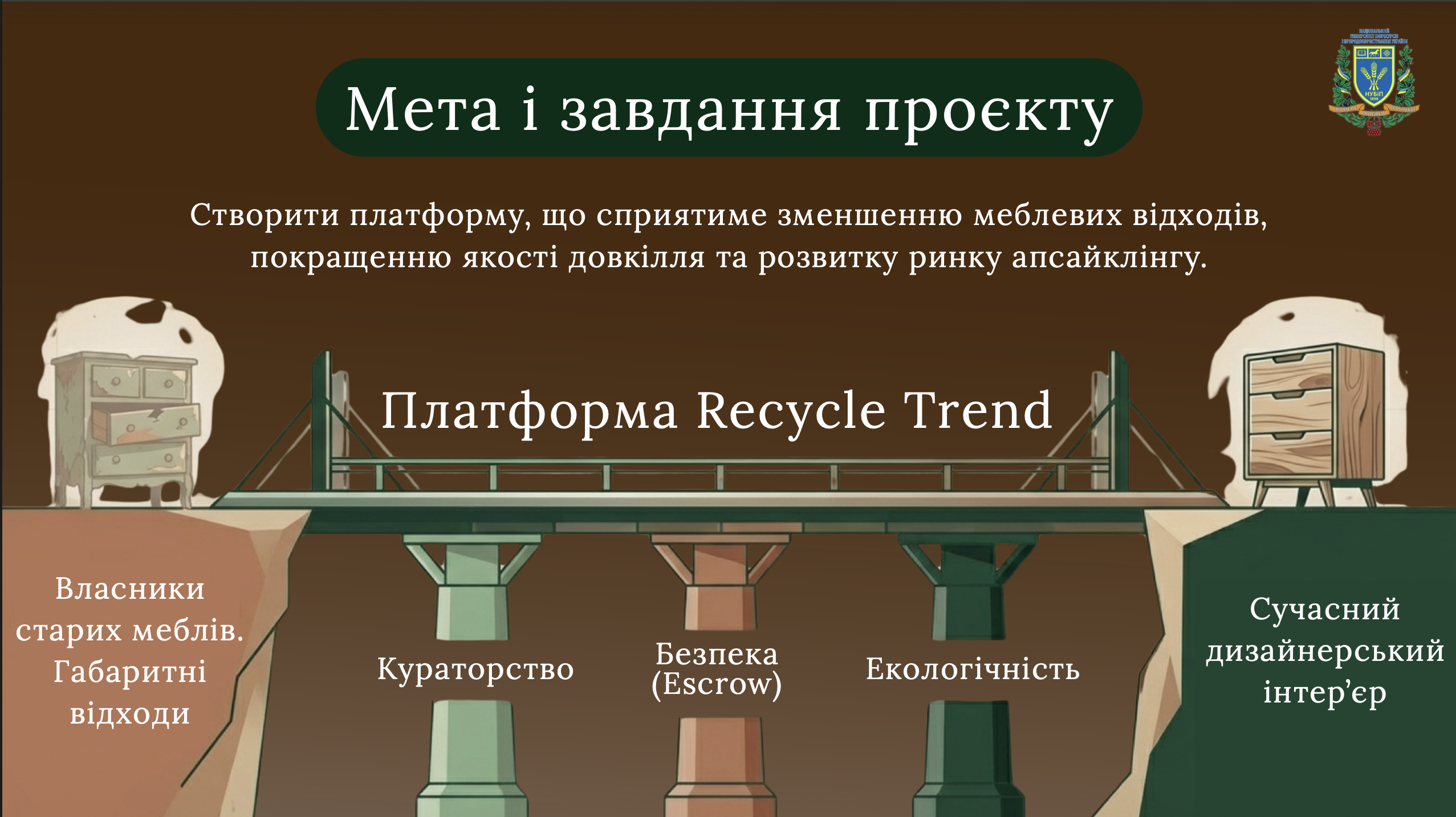 У межах хакатону команда працювала над проєктом «Recycle Trend» (маркетплейс апсайклінгу) — цифровою платформою, що об’єднує власників старих меблів, дизайнерів та майстрів для їх відновлення, реставрації та подальшого продажу. Проєкт спрямований на зменшення кількості відходів, популяризацію свідомого споживання та розвиток циркулярної економіки. Платформа передбачає безпечну взаємодію між учасниками, систему оплати, рейтинги, відгуки та зручний пошук виконавців.