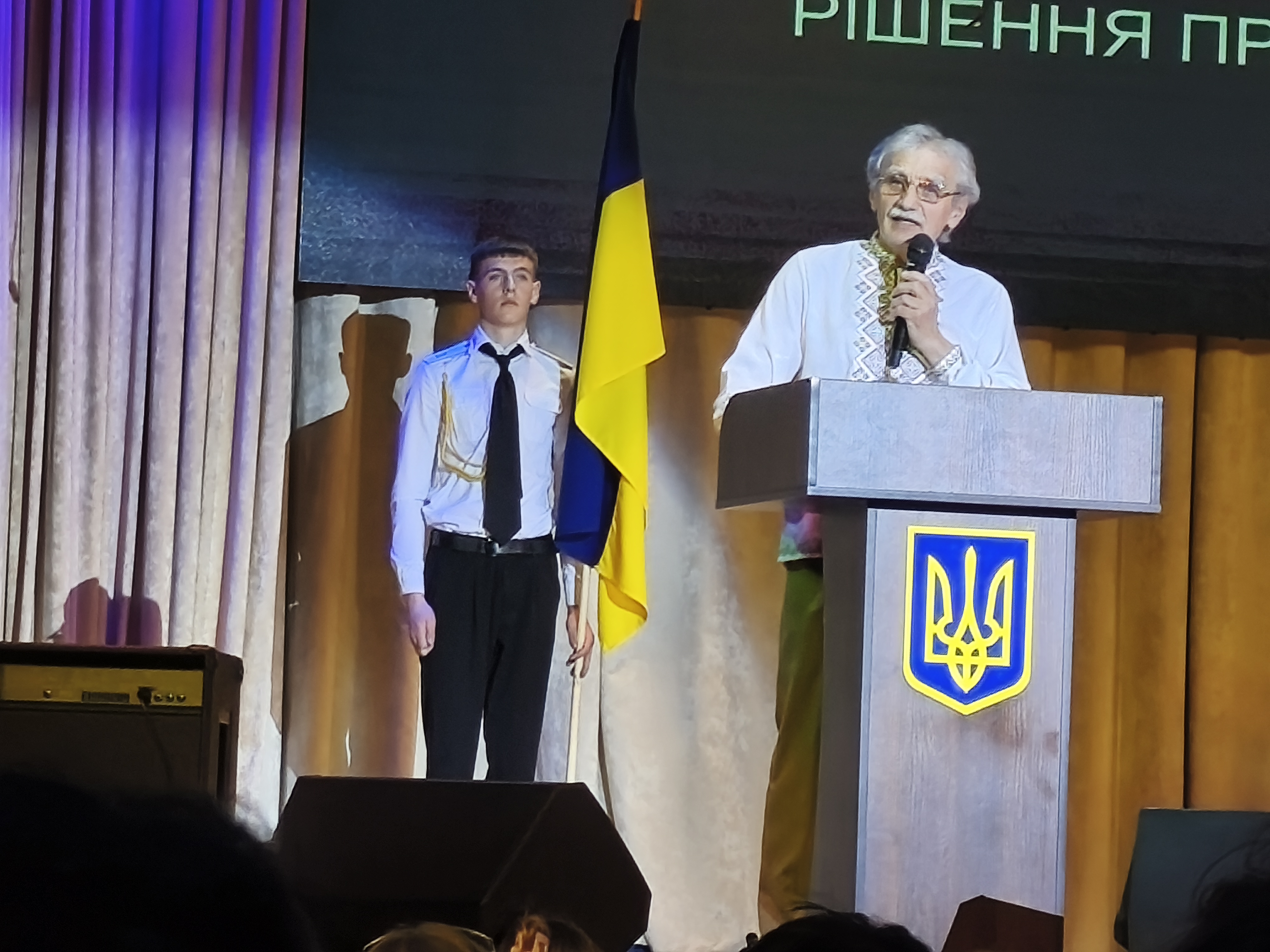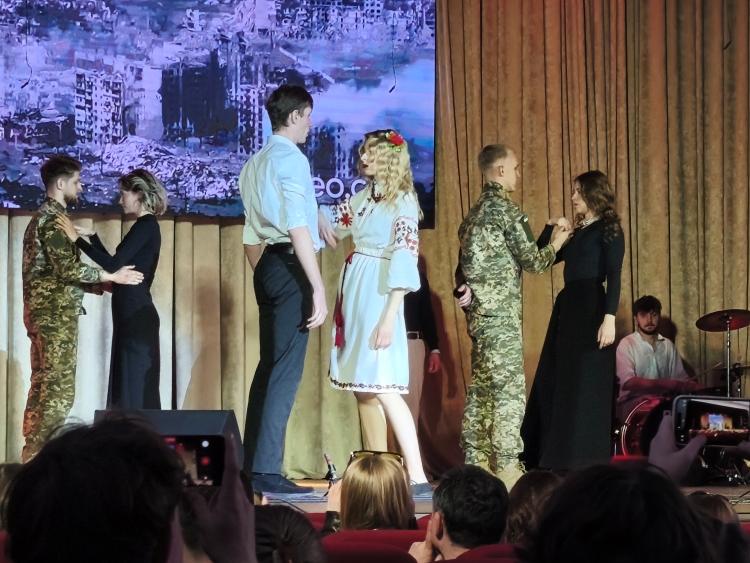Бути освіченим — ще не означає бути вільним. Бути сучасним — не завжди означає бути собою. Але бути інтелігентом це бути патріотом, який навіть в атмосфері моральної задухи, незважаючи на всі перепони, просвітницькою діяльністю здіймає хвилі національної свідомості народу та розганяє «хмари», прагнучи до світла... Цю ідею Івана НЕЧУЯ-ЛЕВИЦЬКОГО неперевершено втілили в авторській постановці студенти та викладачі факультету конструювання та дизайну. Багаторічний натхненник творчої команди доцент Андрій НЕСВІДОМІН зробив все для того, щоб 15 хвилин пролетіли як мить, хоча в них було стільки сили і глибини! А коли за трибуну вийшов професор кафедри нарисної геометрії, комп'ютерної графіки та дизайну Віктор НЕСВІДОМІН, глядацька зала застигла, наче з екранних кадрів на сцену насправді спустився В'ячеслав ЧОРНОВІЛ… До слова, виставка художньої творчості цього факультету була органічно переплетена із творчою програмою.