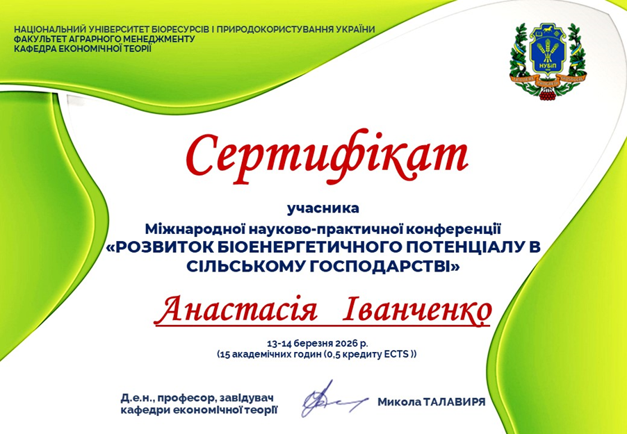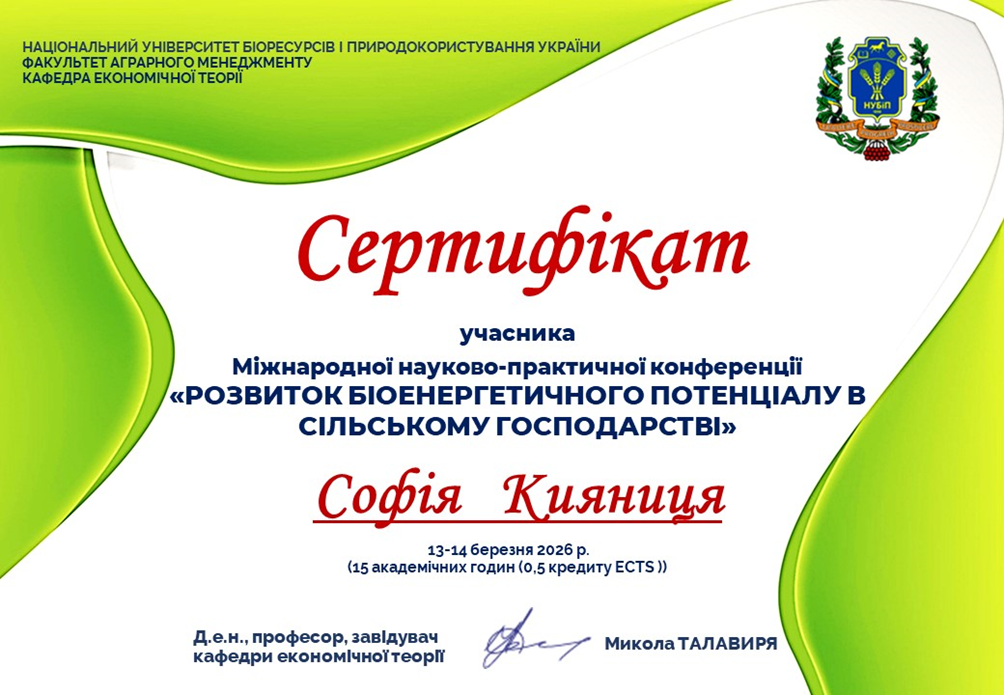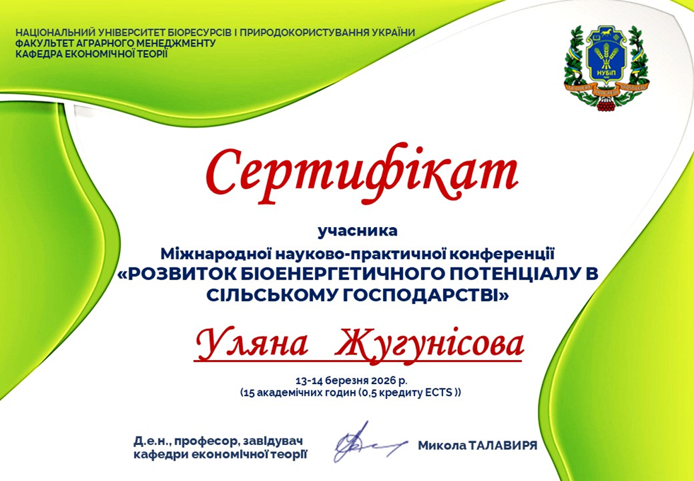 Студенти гуртка “Макроекономічні аспекти економічного зростання в Україні” брали участь у Міжнародній науково-практичні конференції “Розвиток біоенергетичного потенціалу в сільському господарстві", яка відбулася 13-14 березня 2026 року, де зустрілися найкращі експерти, практики та науковці цього напрямку для обміну знаннями й досвідом.