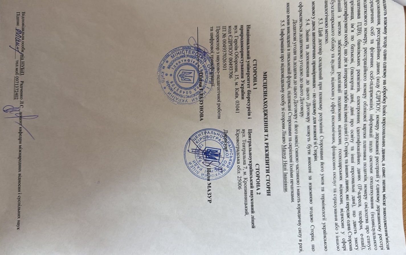 Важливим підсумком такого візиту стало підписання договору про співпрацю між Національним університетом біоресурсів і природокористування України та Центрально-українським науковим ліцеєм. Договір з боку ліцею підписала його директорка Неля Іванівна МАЗУР. Співпраця передбачає проведення спільних освітніх та профорієнтаційних заходів, публічних лекцій, зустрічей зі студентами та викладачами університету тощо.
