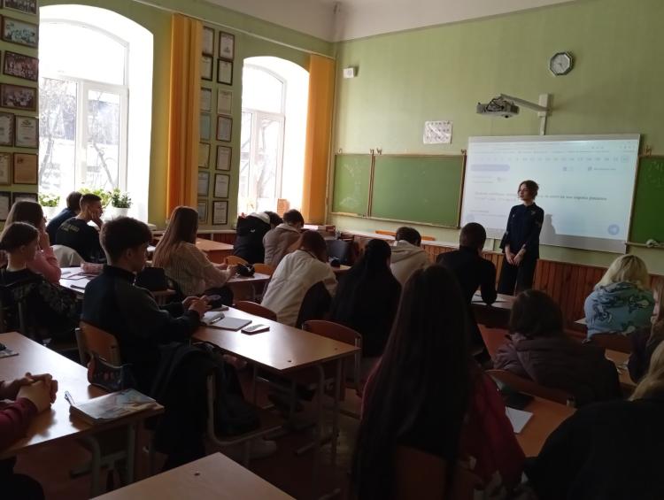 Головним гостем заходу стала студентка другого курсу спеціальності С3 «Міжнародні відносини» Коваленко Аліна, яка сама колись закінчила цей ліцей. Вона поділилася власним досвідом навчання у виші, розповіла про особливості студентського життя, організацію навчального процесу, перебування у гуртожитку та можливості дозвілля. Аліна детально описала участь студентів-міжнародників у наукових конференціях, міжнародних проєктах і програмах академічної мобільності, підкресливши, що сучасний студент НУБіП України має безліч можливостей для особистісного та професійного розвитку.