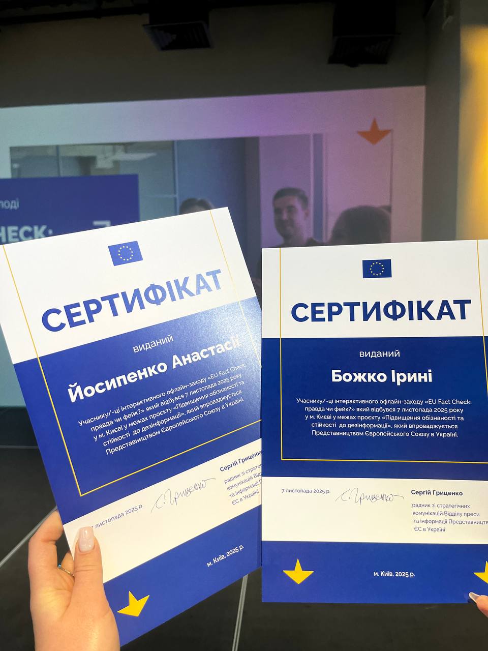 7 листопада студентки 1 курсу спеціальності «Міжнародні відносини» Національного університету біоресурсів і природокористування України Анастасія Йосипенко та Ірина Божко мали змогу долучитися до інтерактивного офлайн-заходу для активної молоді та студентів «EU Fact Check: правда чи фейк?», організованого Представництвом Європейського Союзу в Україні в межах проєкту DARE (Disinformation Awareness and Resilience). Подія відбулася у просторі UNIT.City в Києві та об’єднала студентів, молодь і громадських активістів, небайдужих до теми боротьби з дезінформацією.