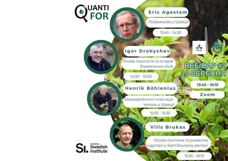 19 вересня для лісівників України проведено міжнародний вебінар у дистанційному форматі із синхронним перекладом з англійської на українську мову за участі шведських колег-лісівників. Вебінар проведено в межах міжнародного проєкту «QuantiFOR: Розвиток спроможності у кількісних методах та науковій експертизі для молодих лісових дослідників в Україні». Грантова угода між НУБіП України та Шведським університетом сільськогосподарських наук (SLU) реалізується за фінансової підтримки Шведського інституту (SI).