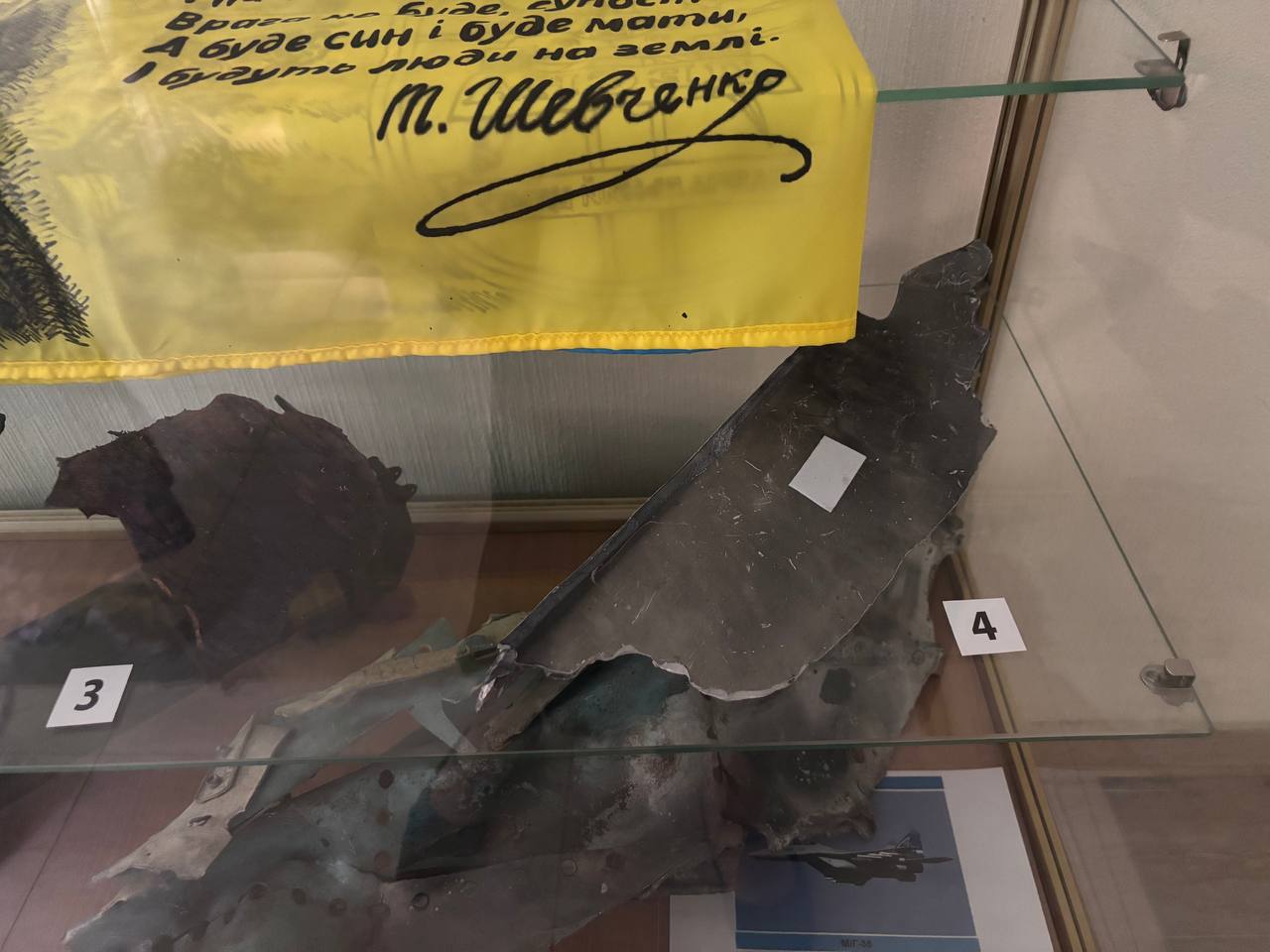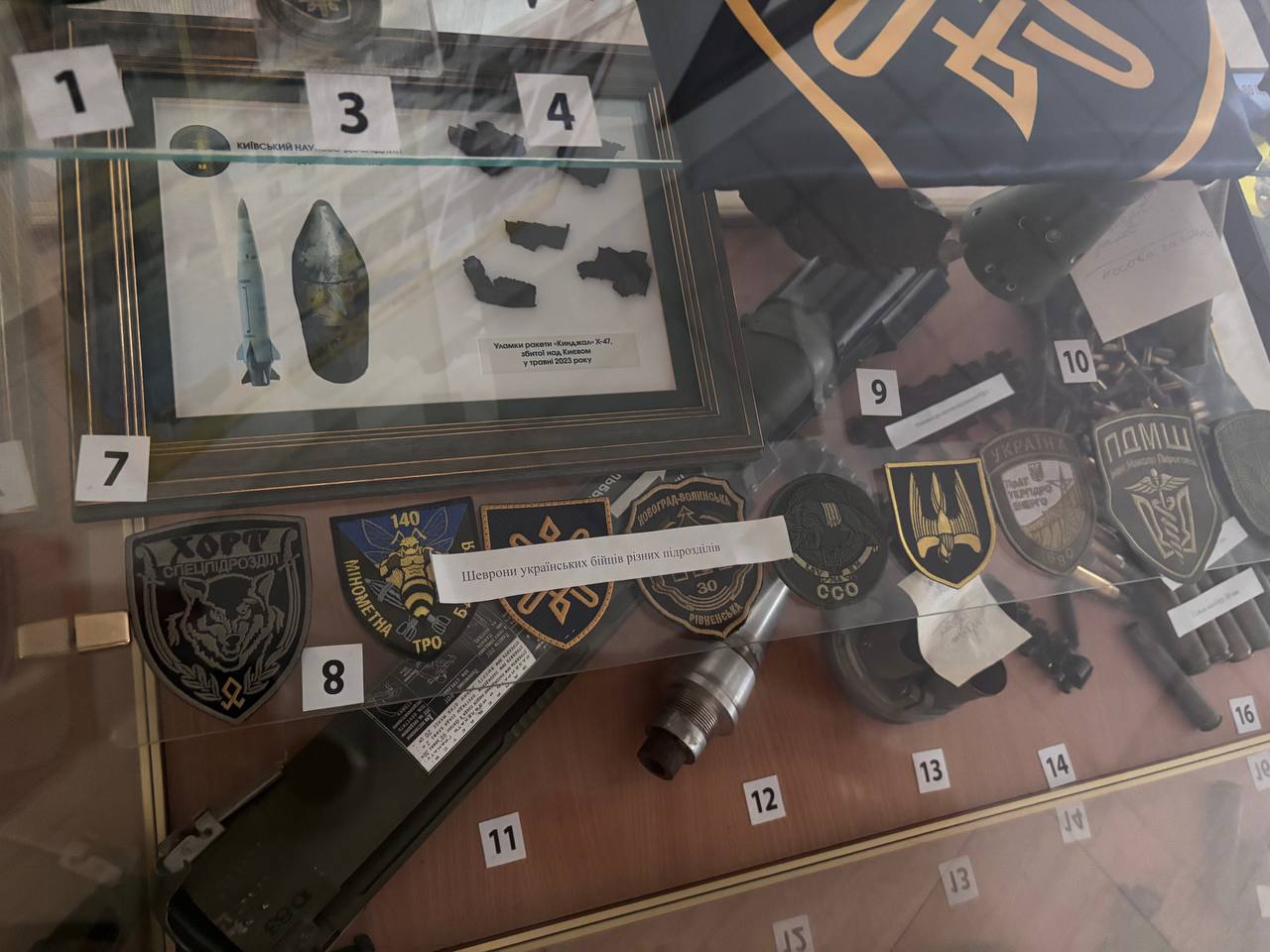 На експозиції можна побачити різні предмети, які відображають повсякдення війни та її трагічні наслідки: уламки авіаційних ракет і снарядів, тубуси гранатометів, мінометні міни, кулеметні стрічки та гільзи. Тут представлені засоби індивідуального захисту, уламки техніки, пошкоджені деталі боєприпасів, шеврони бойових підрозділів і прапори з підписами бійців. Усе це створює багатовимірний образ війни, що розкриває не лише її матеріальну сторону, але й духовну силу українського народу.