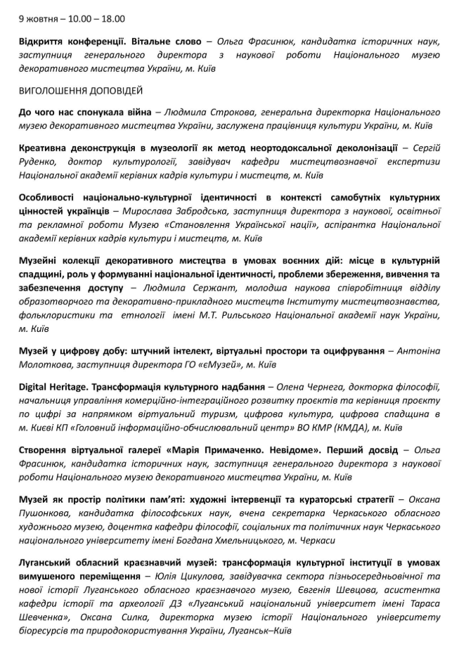 У роботі конференції взяли участь відомі фахівці галузі: Людмила СТРОКОВА, генеральна директорка Національного музею декоративного мистецтва України, заслужена працівниця культури України; Сергій РУДЕНКОо, доктор культурології, завідувач кафедри мистецтвознавчої експертизи Національної академії керівних кадрів культури і мистецтв; Ольга ФРАСИНЮК, кандидатка історичних наук, заступниця генерального директора з наукової роботи Національного музею декоративного мистецтва України; Олена ЧЕРНЕГА, докторка філософії, начальниця управління комерційно-інтеграційного розвитку проєктів КП «Головний інформаційно-обчислювальний центр» (КМДА) та інші.