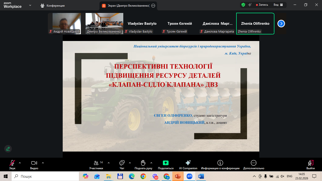 1. «Перспективні технології підвищення ресурсу деталей «клапан-сідло клапана» ДВЗ». Підготував студент магістратури 1-го року навчання, ф-ту КД, спеціальності «Машинобудування» Євген ОЛІФІРЕНКО, керівник – к.т.н., доц. Андрій НОВИЦЬКИЙ.