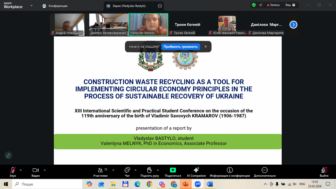 1. «Construction waste recycling as a tool for implementing circular economy principles in the process of sustainable recovery of Ukraine» V. BASTYLO, V. MELNYK (Підготував студент 4-го курсу ф-ту КД, спеціальності «Будівництво та цивільна інженерія» Владислав БАСТИЛО, керівник – к.е.н., доц. Валентина МЕЛЬНИК)