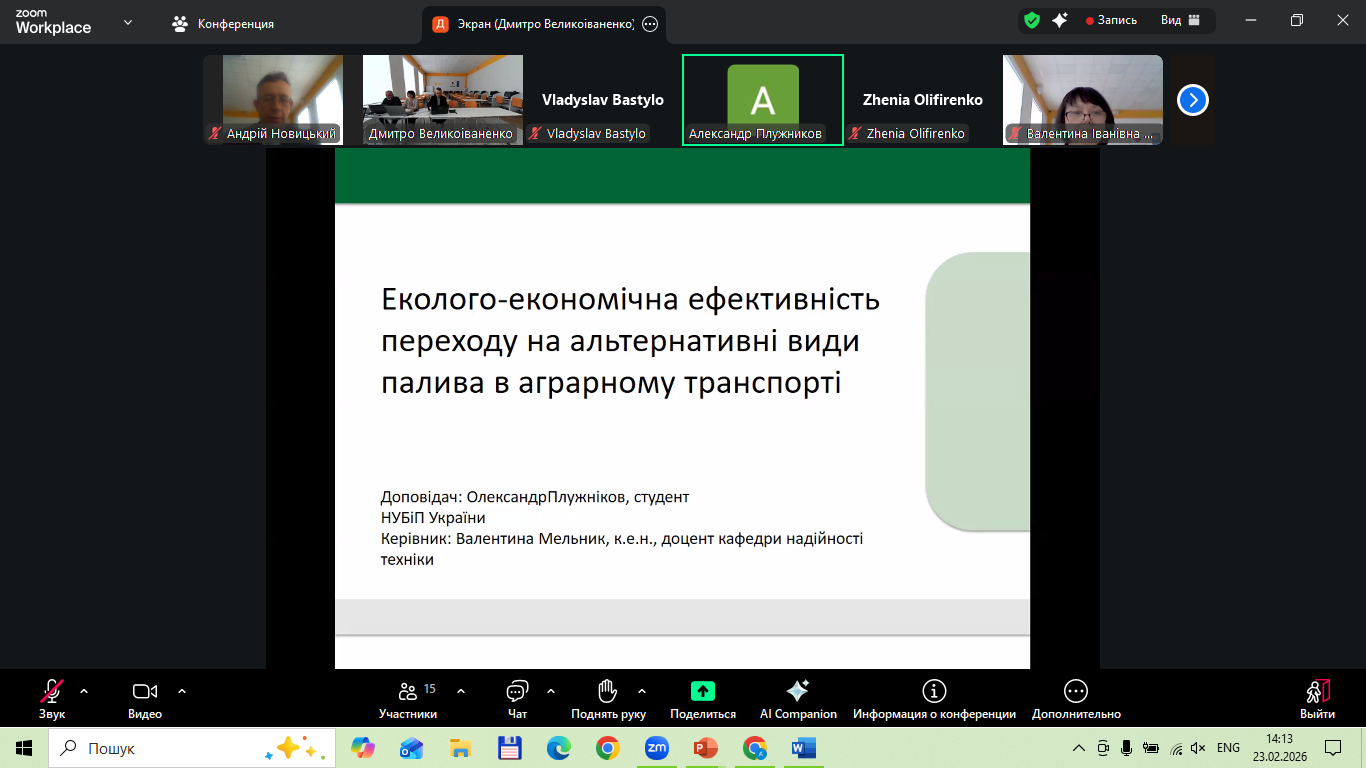 6. «Еколого-економічна ефективність переходу на альтернативні види палива в аграрному транспорті». Підготував студент магістратури 1-го року навчання, МТФ, спеціальності «Транспортні технології» Олександр ПЛУЖНІКОВ, керівник – к.е.н., доц. Валентина МЕЛЬНИК