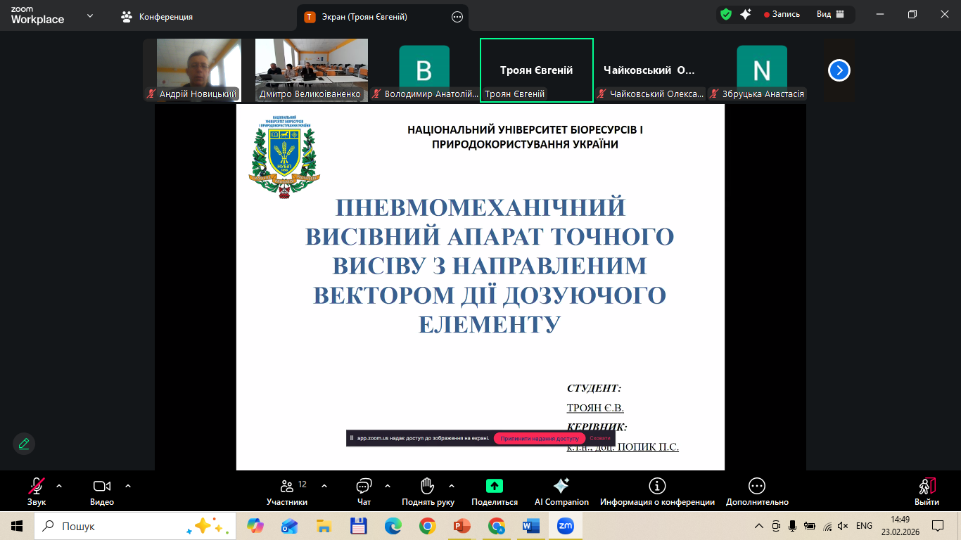 7. «Пневмомеханічний висівний апарат точного висіву з направленим вектором дії дозуючого елементу». Підготував студент 1-го, курсу ф-ту КД, спеціальності «Машинобудування» Євгеній ТРОЯН, керівник – к.т.н., доц. Павло ПОПИК