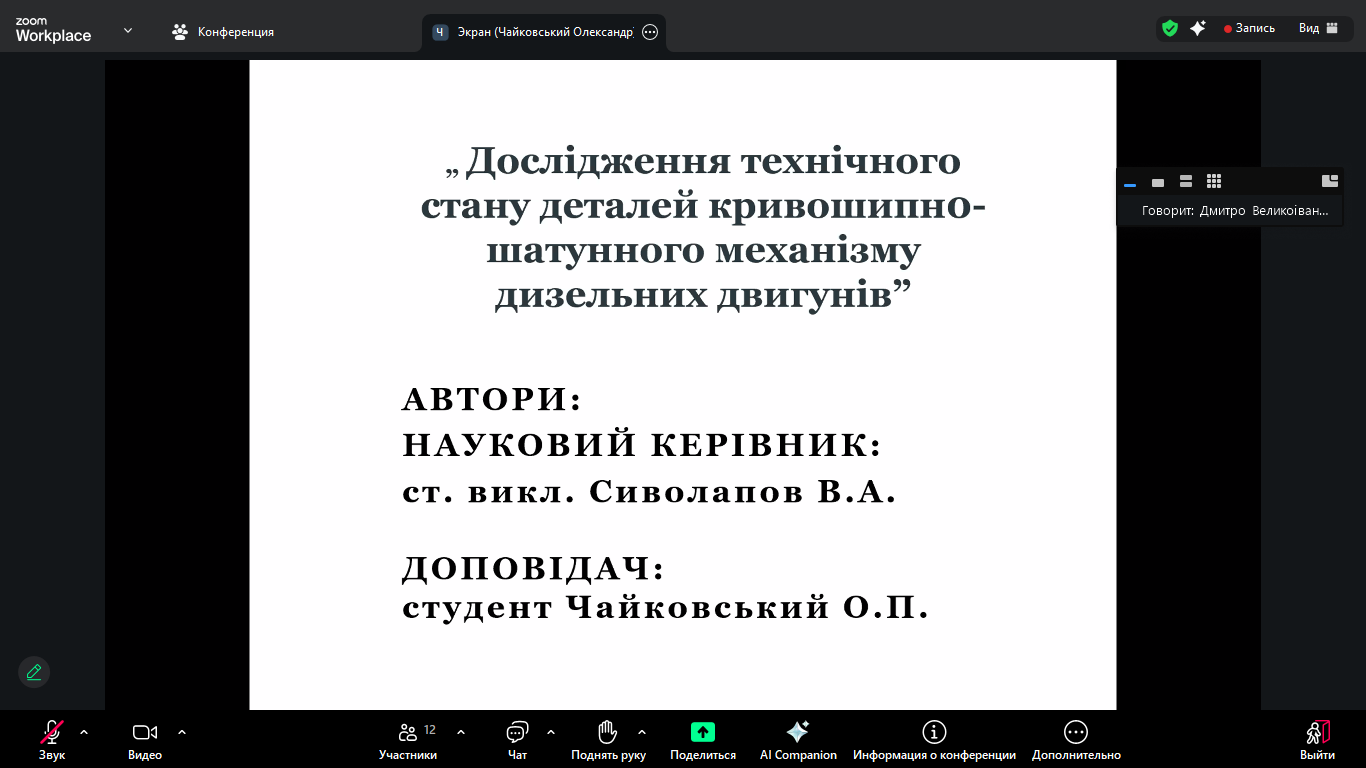 10. «Форсовані випробування деталей циліндро-поршневої групи двигуна ЯМЗ-238 на зносостійкість деталей в залежності від очищення повітря» Підготував студент 4-го курсу, МТФ, спеціальності «Агроінженерія» Олександр ЧАЙКОВСЬКИЙ, керівник – ст. викладач Володимир СИВОЛАПОВ