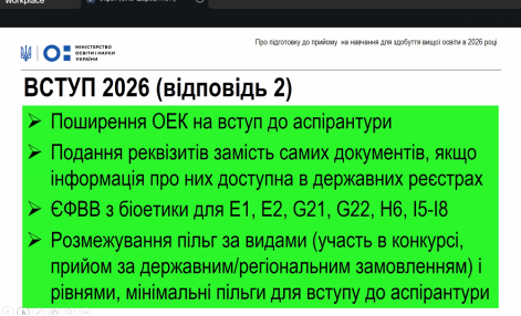Надалі мова пішла про Вступну компанія 2026 року, яка буде відбуватись згідно Проєкту «Про внесення змін до деяких Законів України щодо державної підсумкової атестації та вступної кампанії 2026 року», який набув чинності 25.12.2025року і буде регулюватись Порядком прийому на навчання для здобуття вищої освіти в 2026 році, який буде містити 9 пунктів.