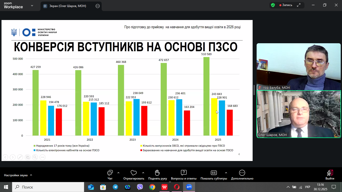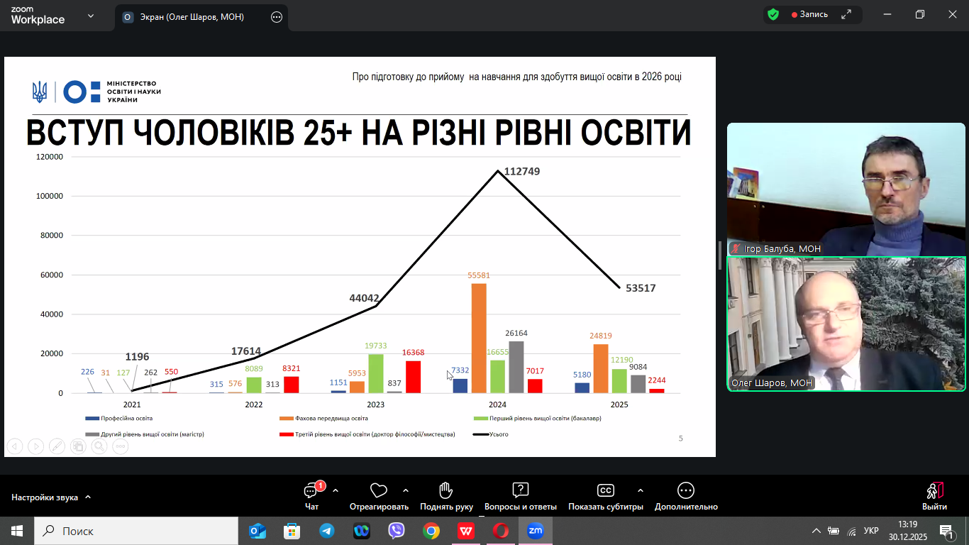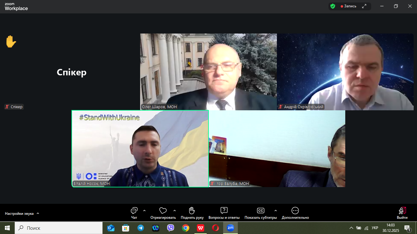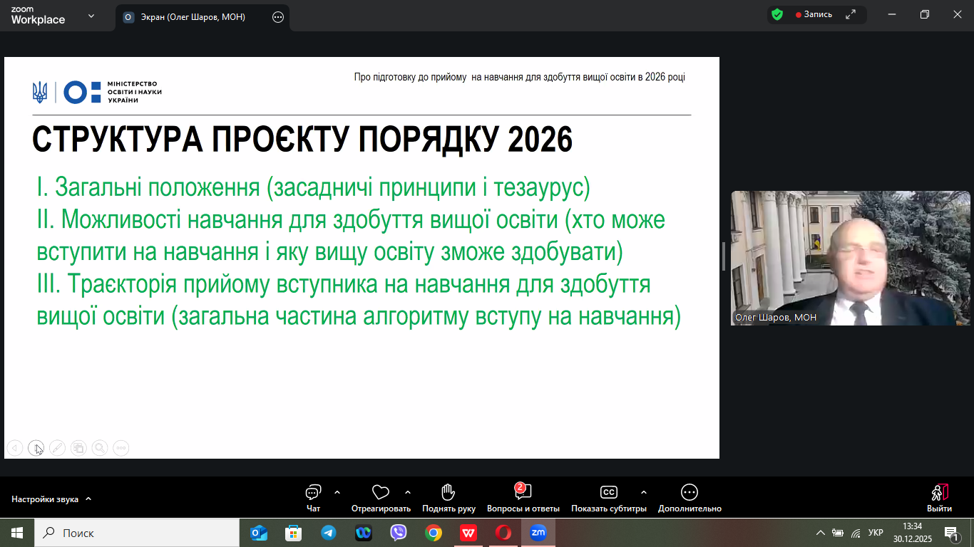 30 грудня 2026 року в онлайн-форматі відбулася нарада, на якій обговорювалися питання щодо винесення на громадське обговорення Порядку прийому на навчання для здобуття вищої освіти в 2026 році, яка зібрала понад 500 учасників з усіх регіонів України.