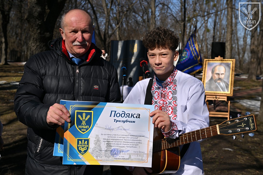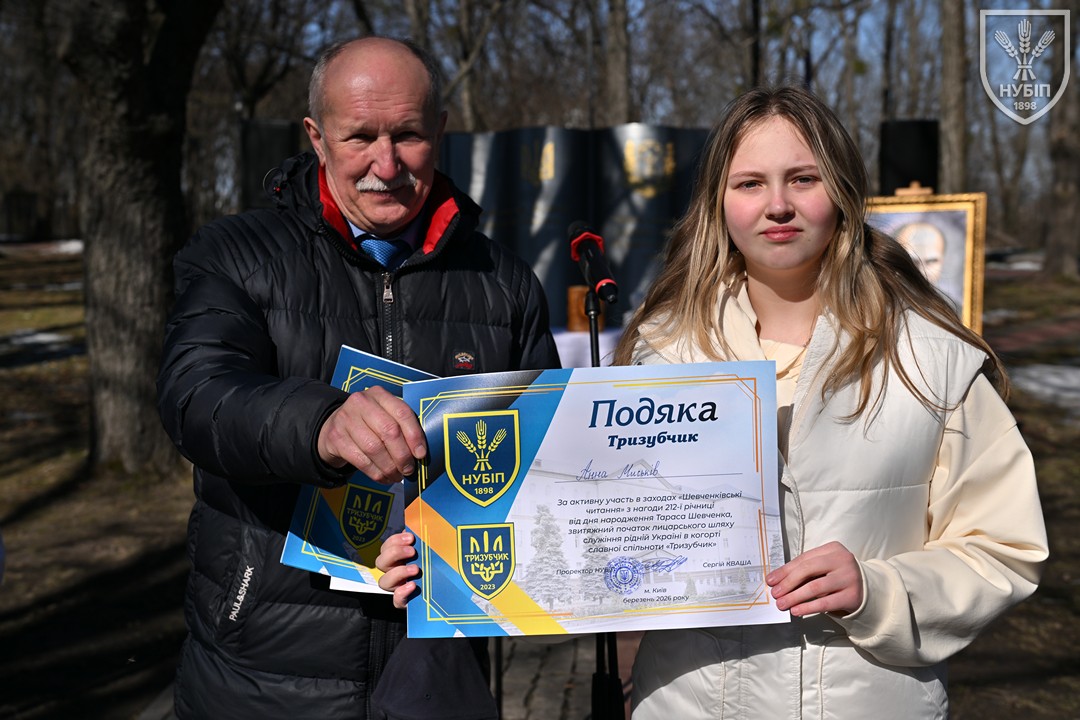 До читань активно долучилися й інші студенти та співробітники університету, які декламували уривки з поезій Кобзаря, демонструючи глибоку повагу до української літературної спадщини. Окрасою заходу стала участь дітей співробітників університету зі спільноти «Тризубчик», які також долучилися до читання поезій Тараса ШЕВЧЕНКА. За щирість виконання, любов до українського слова та активну участь у вшануванні пам’яті Кобзаря юних учасників було відзначено подяками. Їхній виступ став особливо зворушливим моментом події та ще раз підтвердив, що Шевченкове слово живе й передається від покоління до покоління.