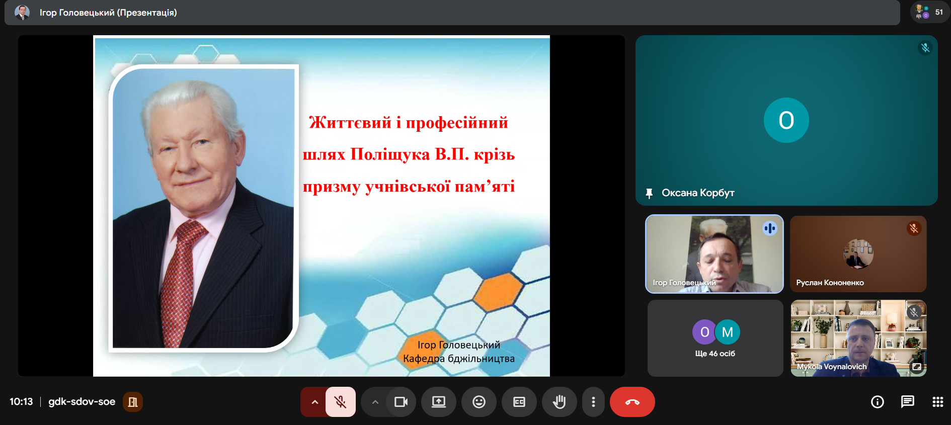 Пленарну частину конференції відкрив Ігор Головецький, доцент кафедри бджільництва, учень Віктора Петровича, який мав честь працювати поруч із ним понад 20 років. У доповіді «Життєвий і професійний шлях Поліщука В.П. крізь призму учнівської пам’яті» доповідач представив постать видатного науковця й педагога, окреслив основні віхи його професійного становлення та вагомий внесок у розвиток української школи бджільництва, селекційної справи й підготовку висококваліфікованих спеціалістів для галузі. Виступ поєднав наукову ґрунтовність із особистими спогадами, що дозволило глибше відчути масштаб особистості Віктора Петровича та значення його спадщини для сучасного бджільництва.