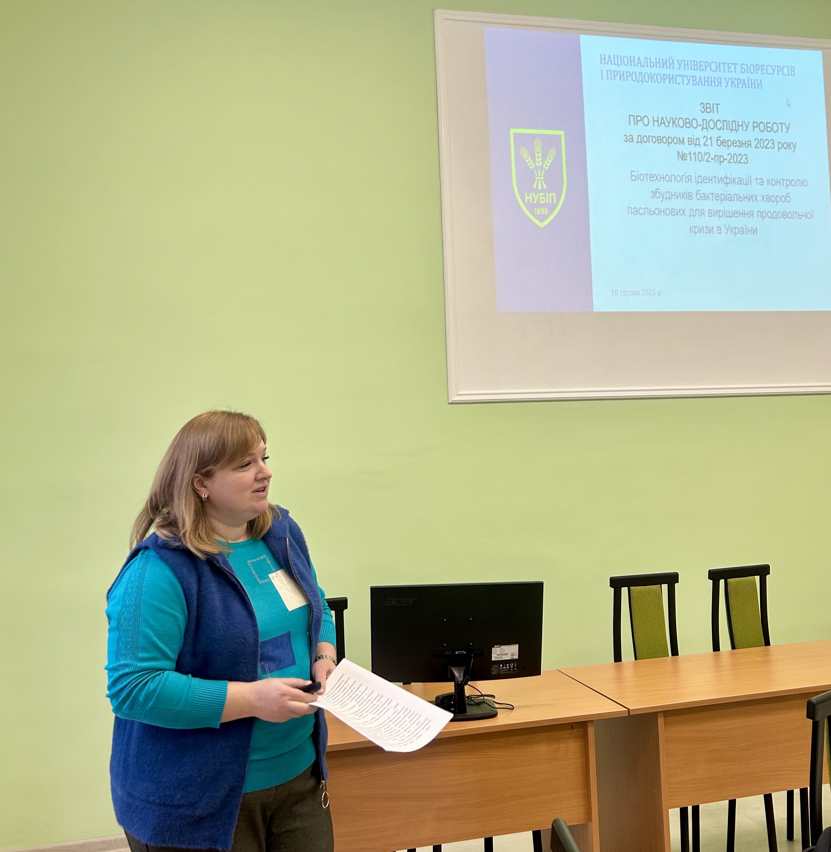 У рамках виконання НДР «Біотехнологія ідентифікації та контролю збудників бактеріальних хвороб пасльонових для вирішення продовольчої кризи в України» (науковий керівник д-р с.-г. наук Юлія КОЛОМІЄЦЬ). Фітопатогенні бактерії, такі як Pseudomonas syringae, Xanthomonas spp., Erwinia amylovora та Clavibacter michiganensis, спричиняють широкий спектр патологій – від плямистостей і гниття до системних уражень, що призводять до загибелі рослин. Ураження бактеріальними хворобами фіксуються на ключових культурах: картоплі, томатах, перці, яблунях, капусті, зернових. Економічні втрати від таких хвороб оцінюються в мільярди доларів щорічно. Для стримування поширення бактеріальних хвороб рослин необхідна інтегрована стратегія: моніторинг патогенів, адаптація агротехнічних практик, розвиток біотехнологій та міжнародна координація у сфері фітосанітарного контролю. За звітний період (2023-2025рр) підготовлено 7 статей у фахових виданнях України, 8 статей у наукових іноземних виданнях, включених до міжнародної наукометричної бази Scopus, 2 монографії, 3 тези доповіді, 2 методичні рекомендації, 2 акти впровадження, 1 участь у всеукраїнських та регіональних науково-технічних/промислових виставкових заходах, 2 укладання господарчого договору, 1 патент на корисну модель, захищено 1 магістерську кваліфікаційну роботу.