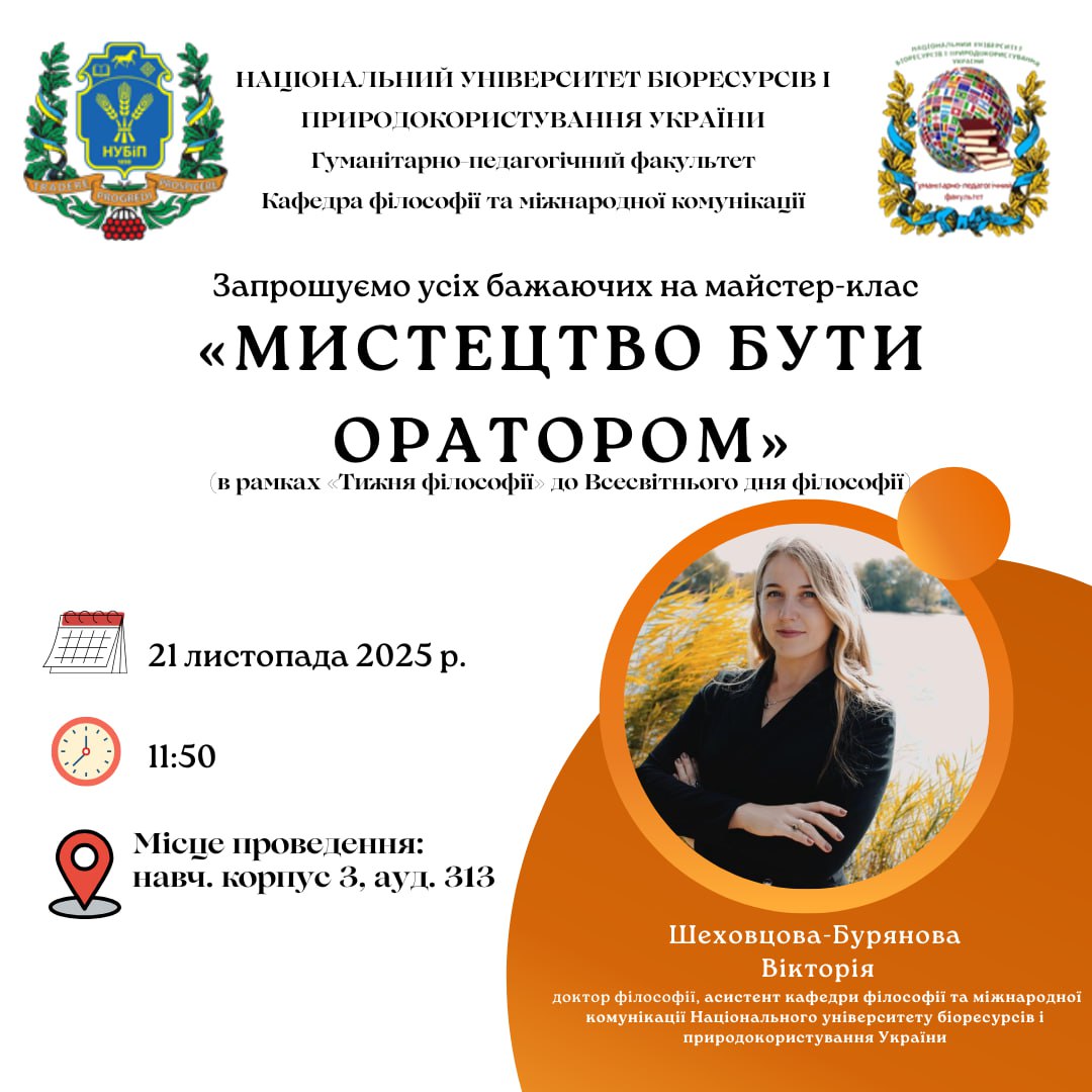 Кафедра філософії та міжнародної комунікації НУБІП України запрошує взяти участь у науково-практичному семінарі «Мистецтво бути оратором» в рамках «Тижня філософії» до Всесвітнього дня філософії