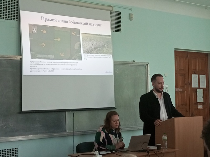 Дмитро БРОВКО, аспірант 2 року навчання кафедри екології агросфери та екологічного контролю в науковій доповіді «Оцінювання збитків, завданих екосистемам Сумської області, унаслідок воєнних дій» зазначив, що на сьогодні існує нагальна потреба у проведенні комплексного оцінювання існуючих і потенційно-можливих впливів воєнних дій на екосистеми на прикладі Сумщини, визначення відповідних наслідків, зокрема щодо рівня засмічення земельних і водних ресурсів, пошкодження та знищення лісових ресурсів, особливо територій природно-заповідного фонду, хімічного й шумового забруднень атмосферного повітря, оцінці збитків у сільськогосподарському виробництві.
