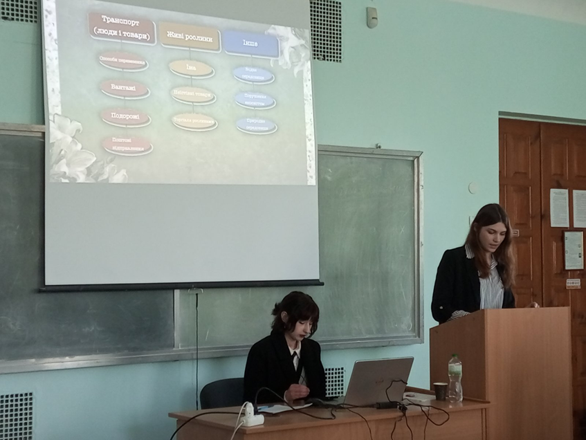 Студентки 2 курсу спеціальності 101 Екологія, факультету захисту рослин, біотехнологій та екології Євгенія ОВДІЄНКО та Аліна КАЧАНОВА зупинились на питанні транскордонної безпеки живих організмів, а саме на системі заходів, спрямованих на захист біологічного різноманіття та здоров'я людини від потенційних ризиків, що виникають внаслідок транскордонного переміщення, транзиту або використання живих організмів (зокрема генетично модифікованих).